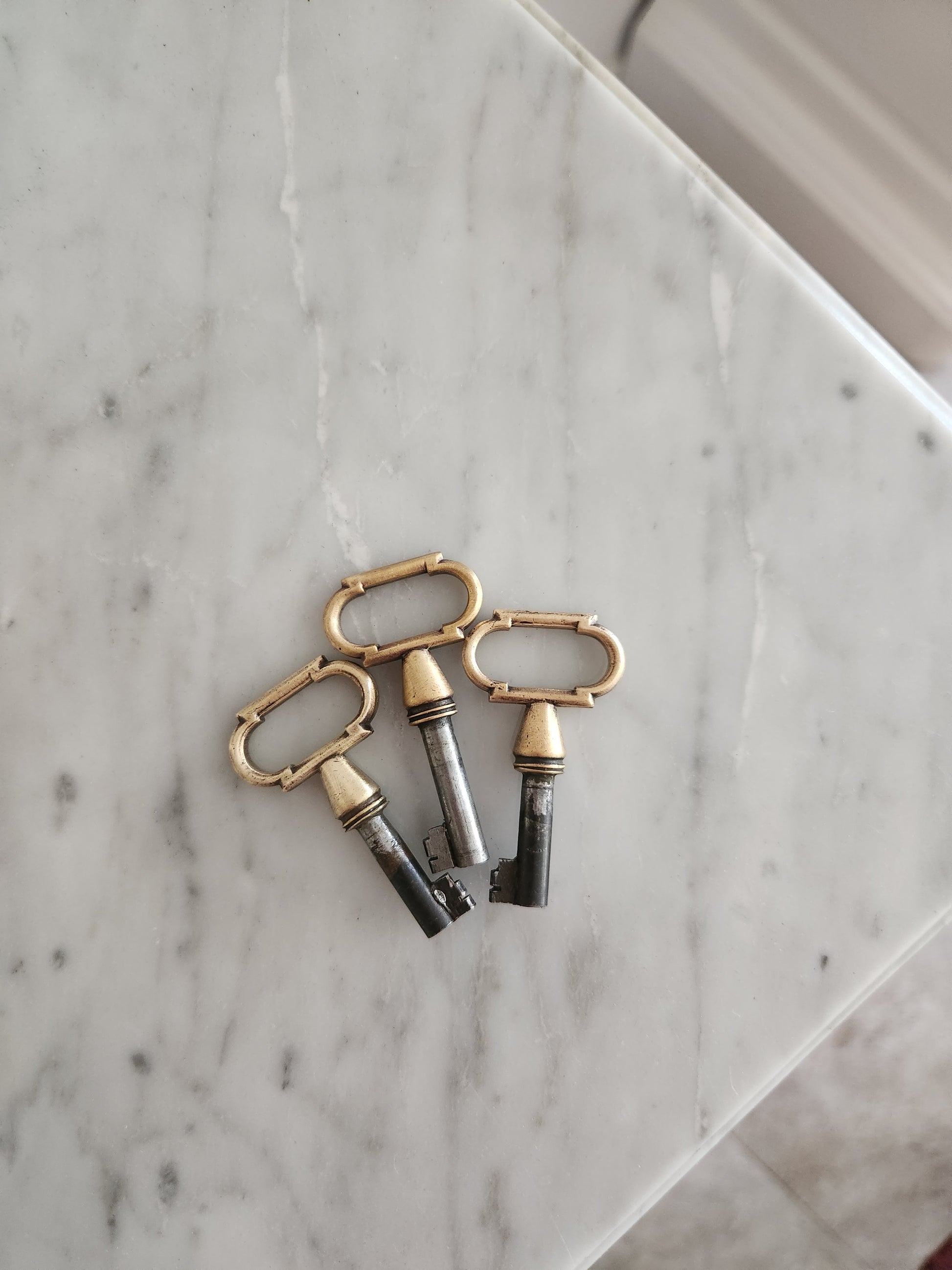 Trois tiroirs en queue d'arronde, quatre portes, trois clefs et les étagères sont réglables en hauteur.
