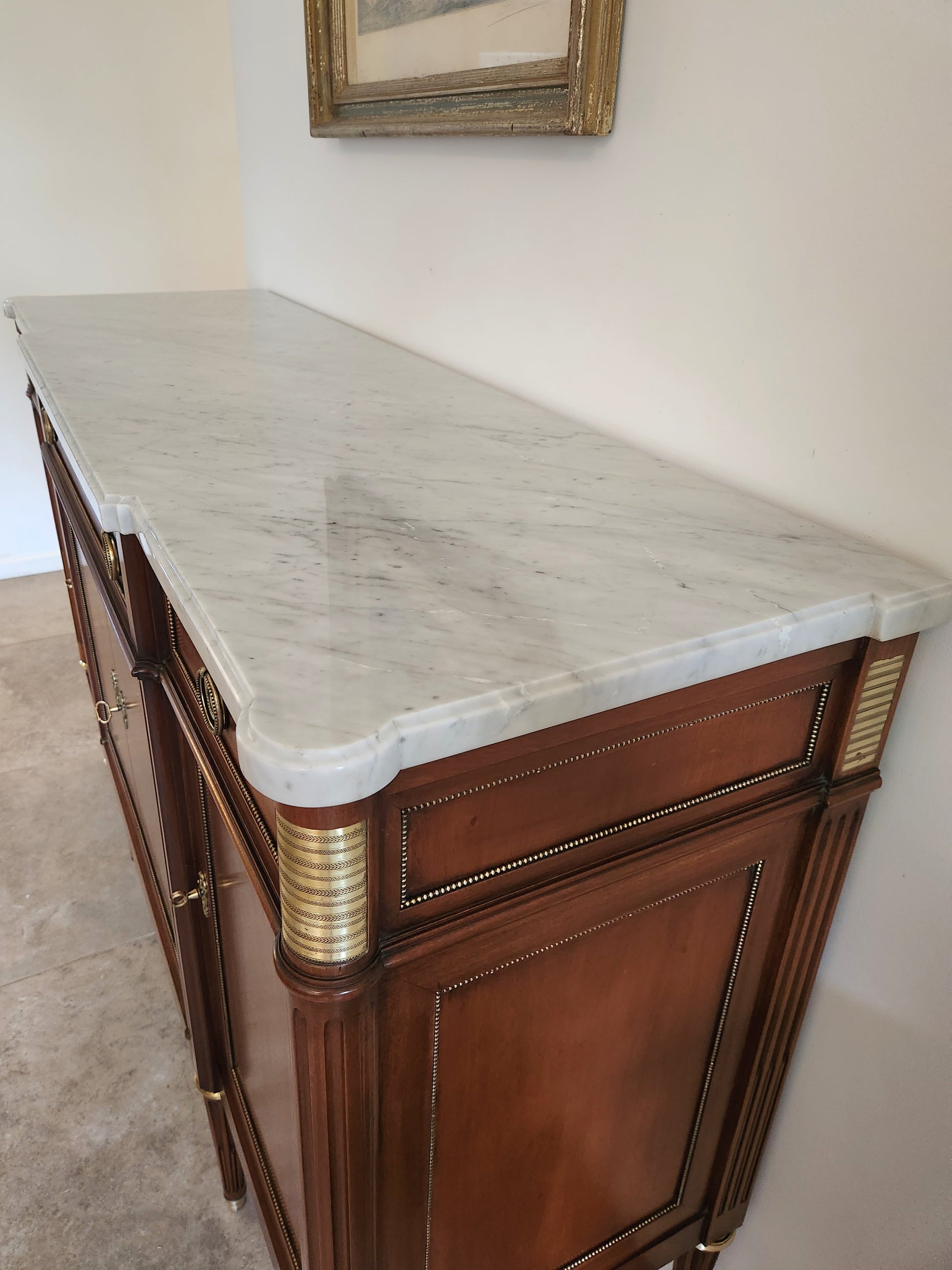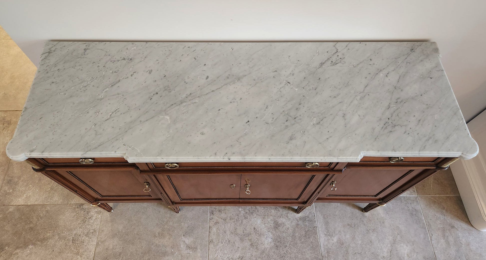Buffet ancien de style Louis XVI, marbre blanc de Carrare, détails en bronze et laiton, montants cannelés terminés par des sabots en bronze doré.
