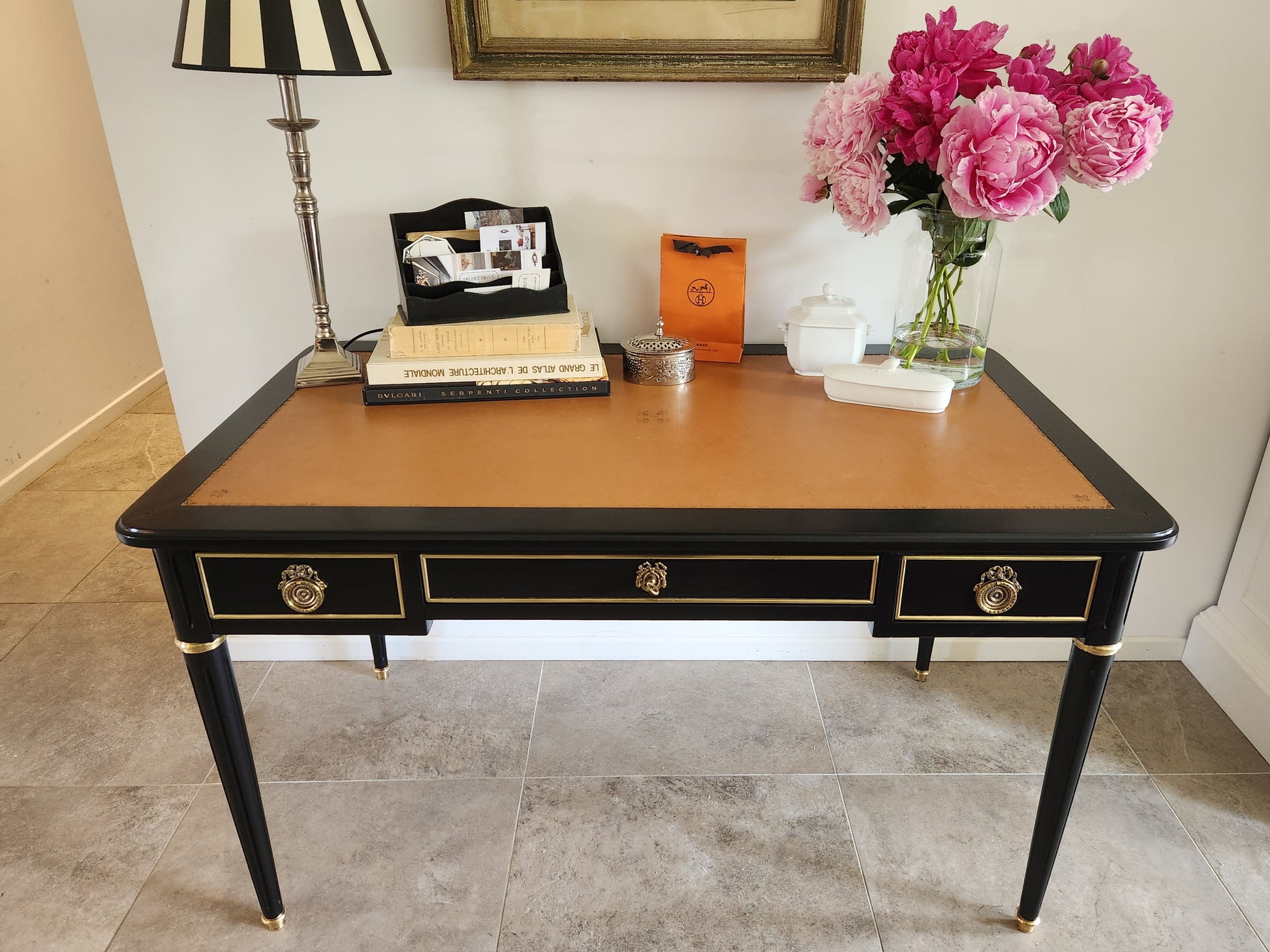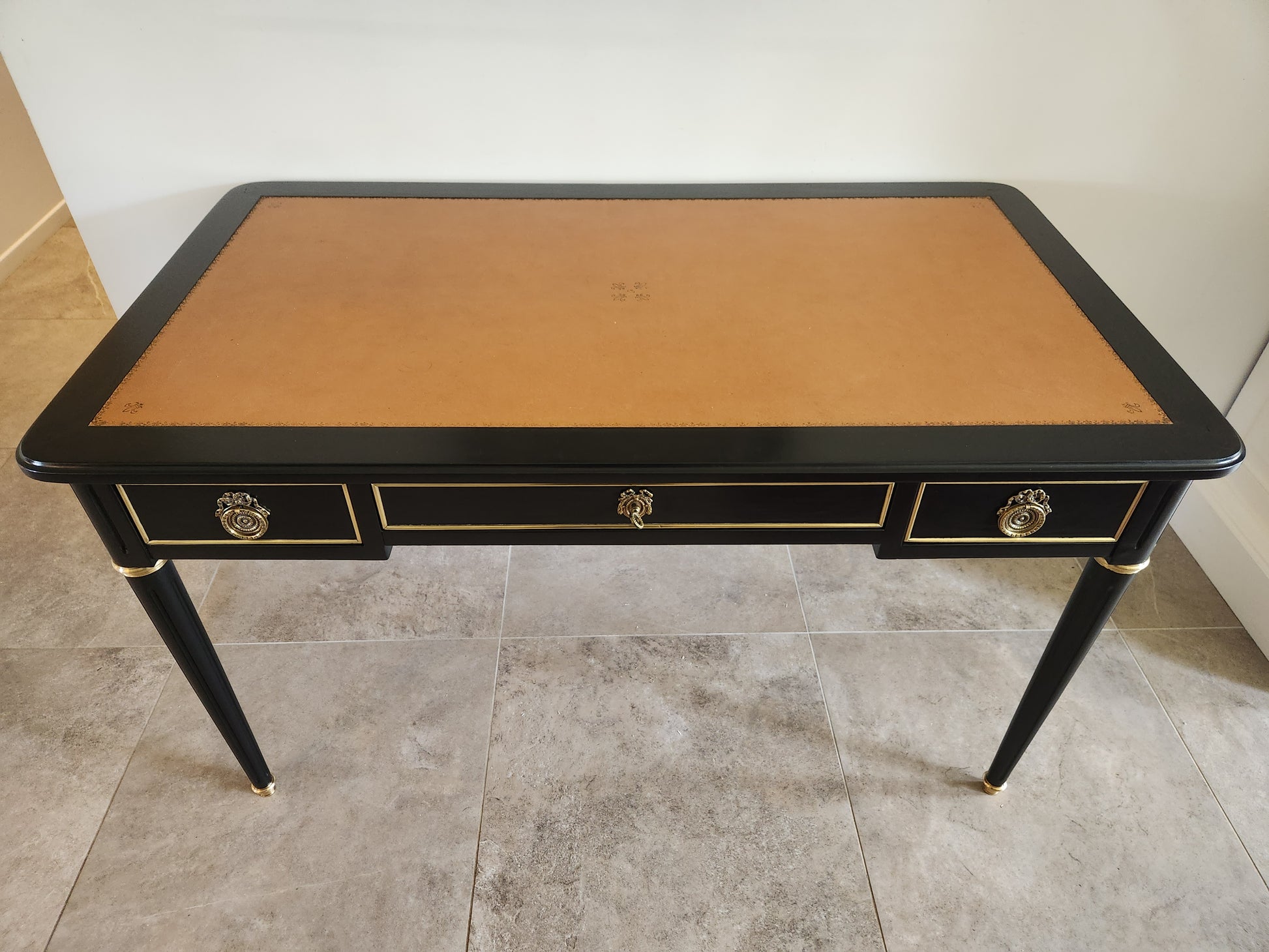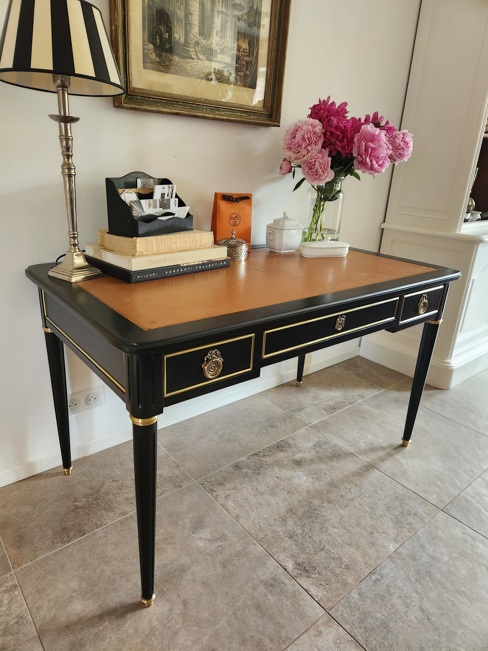Bureau ancien de style Louis XVI avec plateau en cuir couleur cognac.