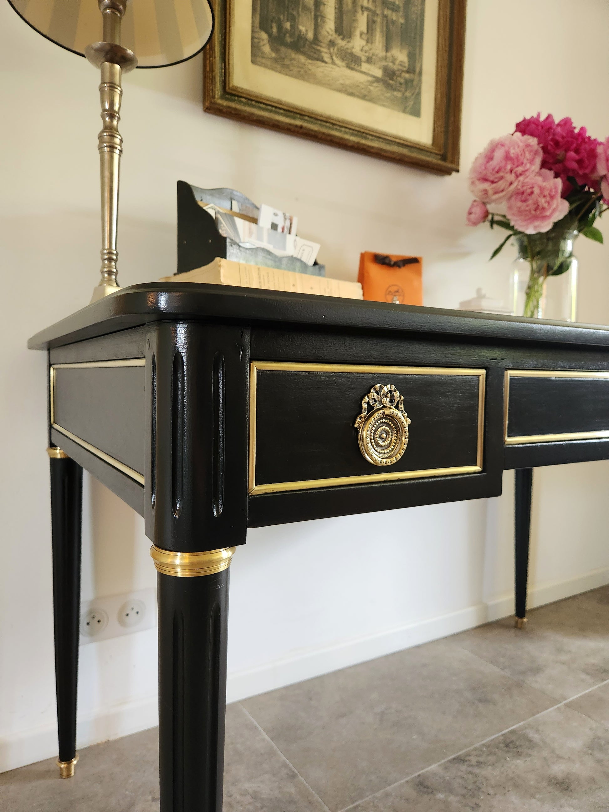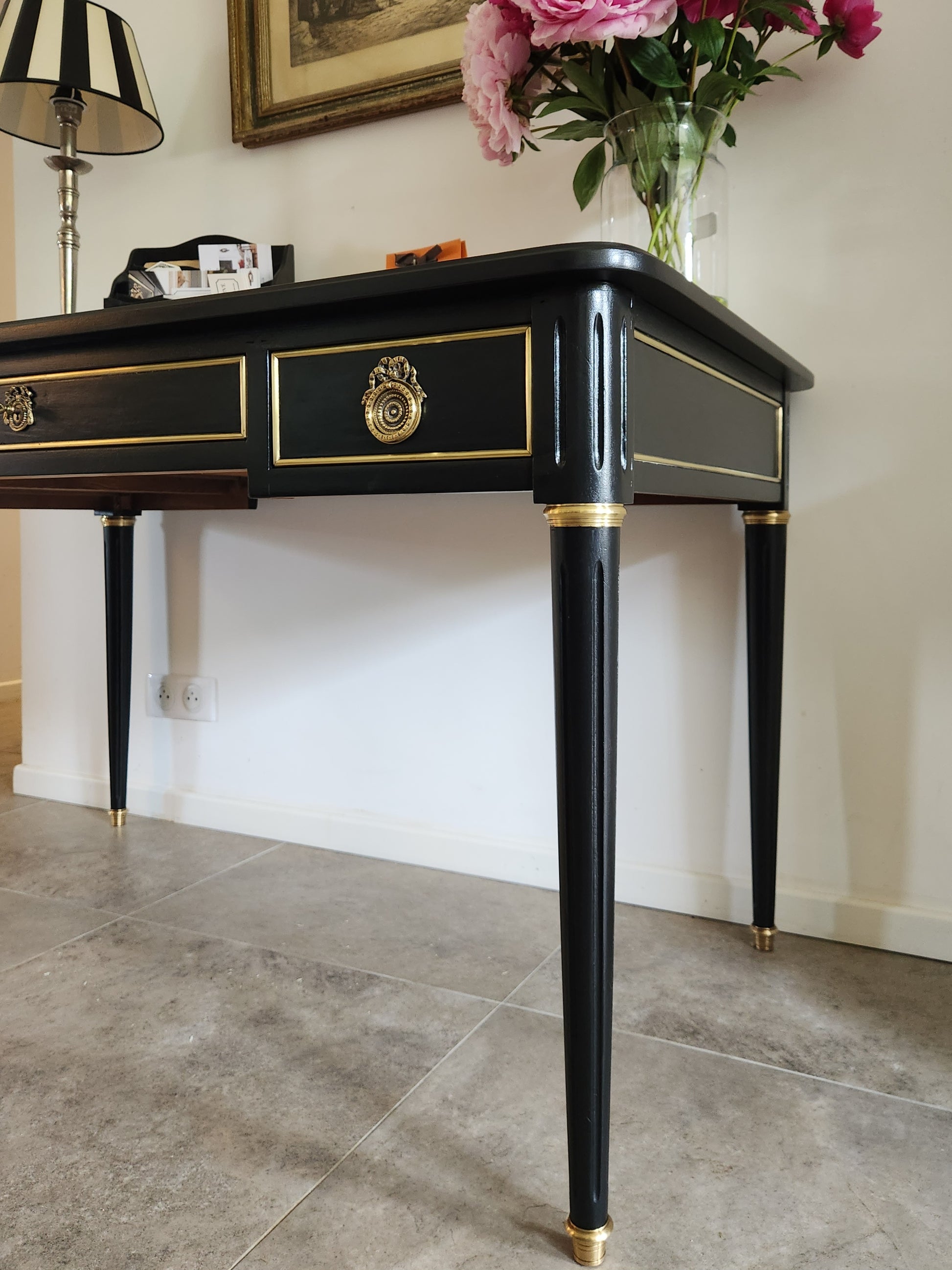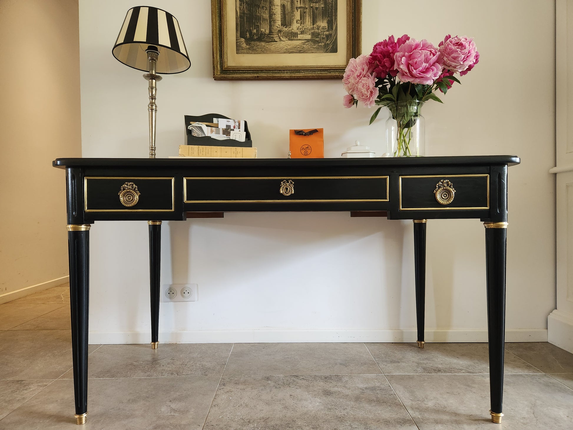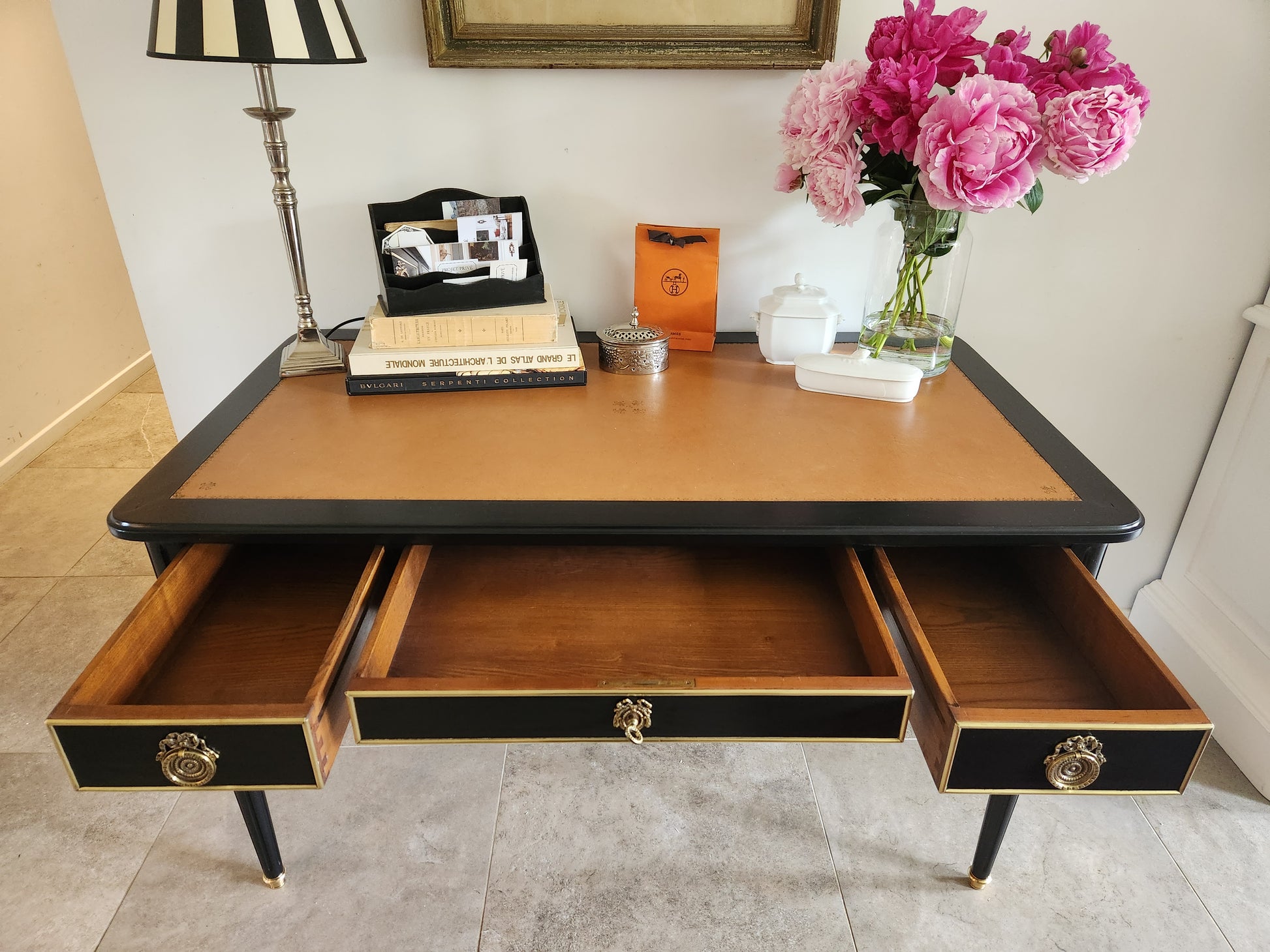 Bureau ancien de style Louis XVI avec plateau en cuir couleur cognac.