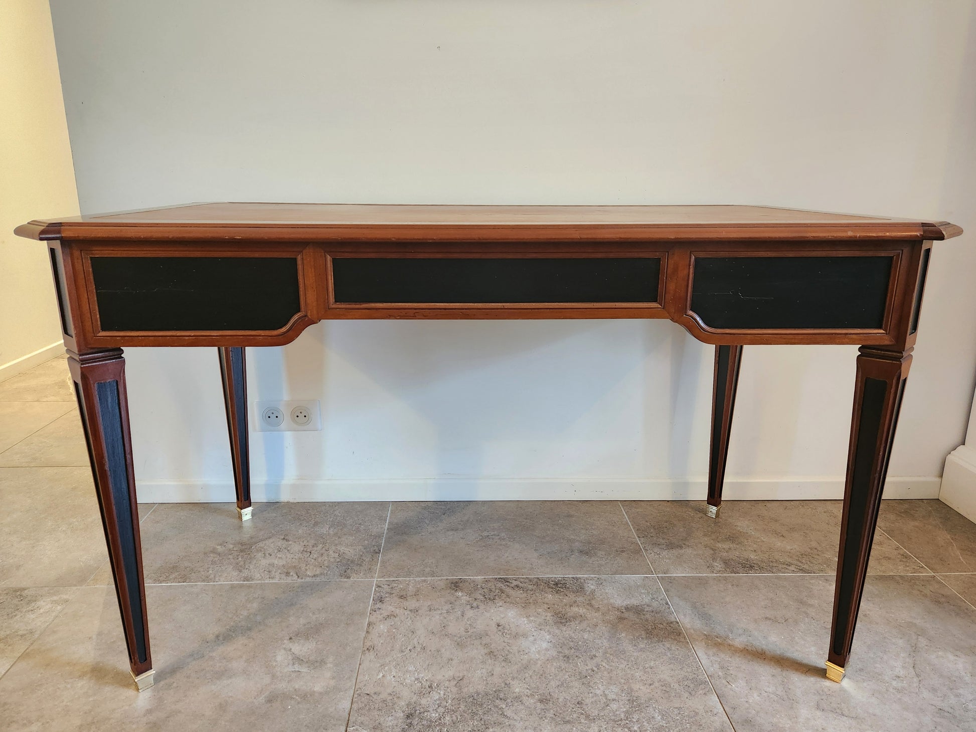 Bureau ancien de style Louis XVI avec plateau en cuir cognac et bord gauffré à l'or.