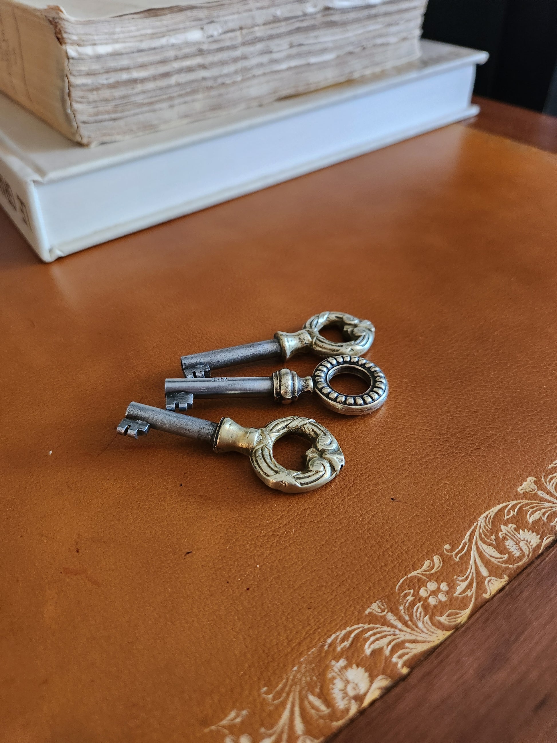 La façade comporte 3 tiroirs en queue d'aronde, les serrures fonctionnent parfaitement, chaque côté est doté d'un plateau coulissant au-dessus en cuir cognac assorti.