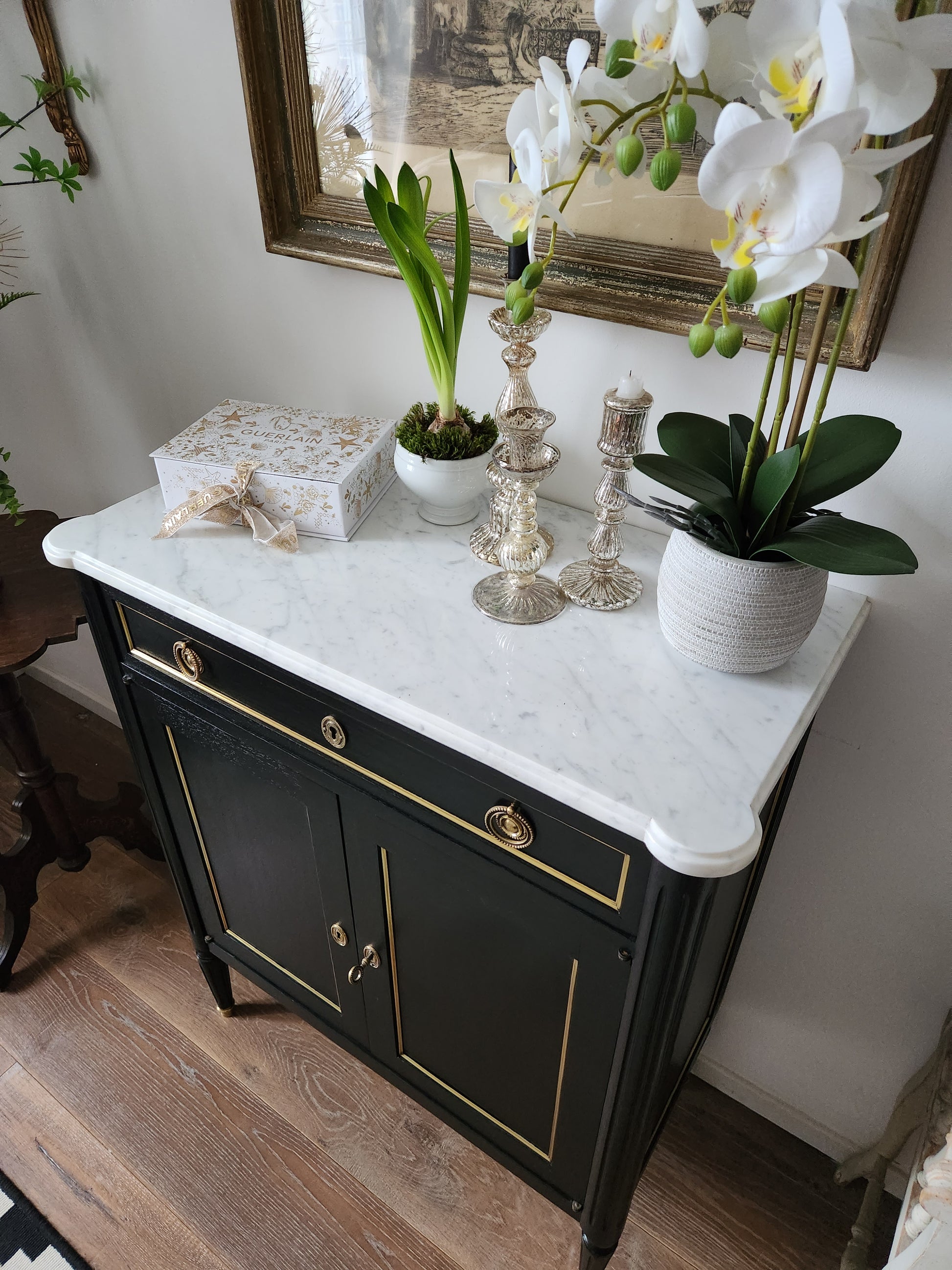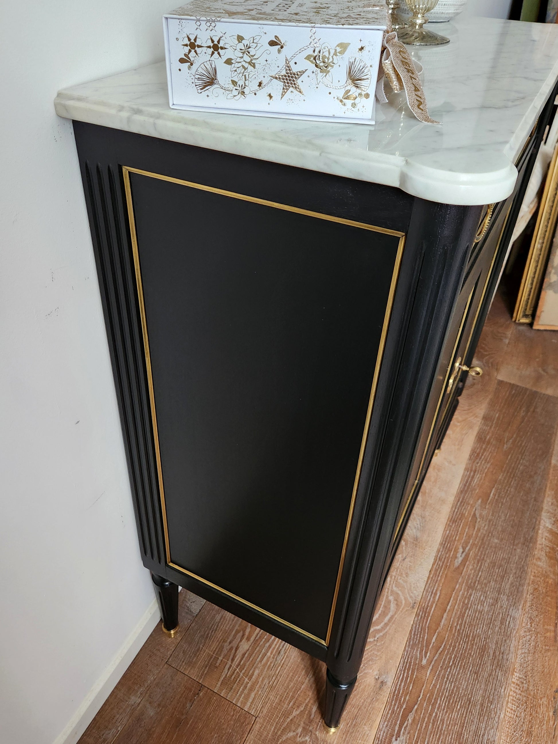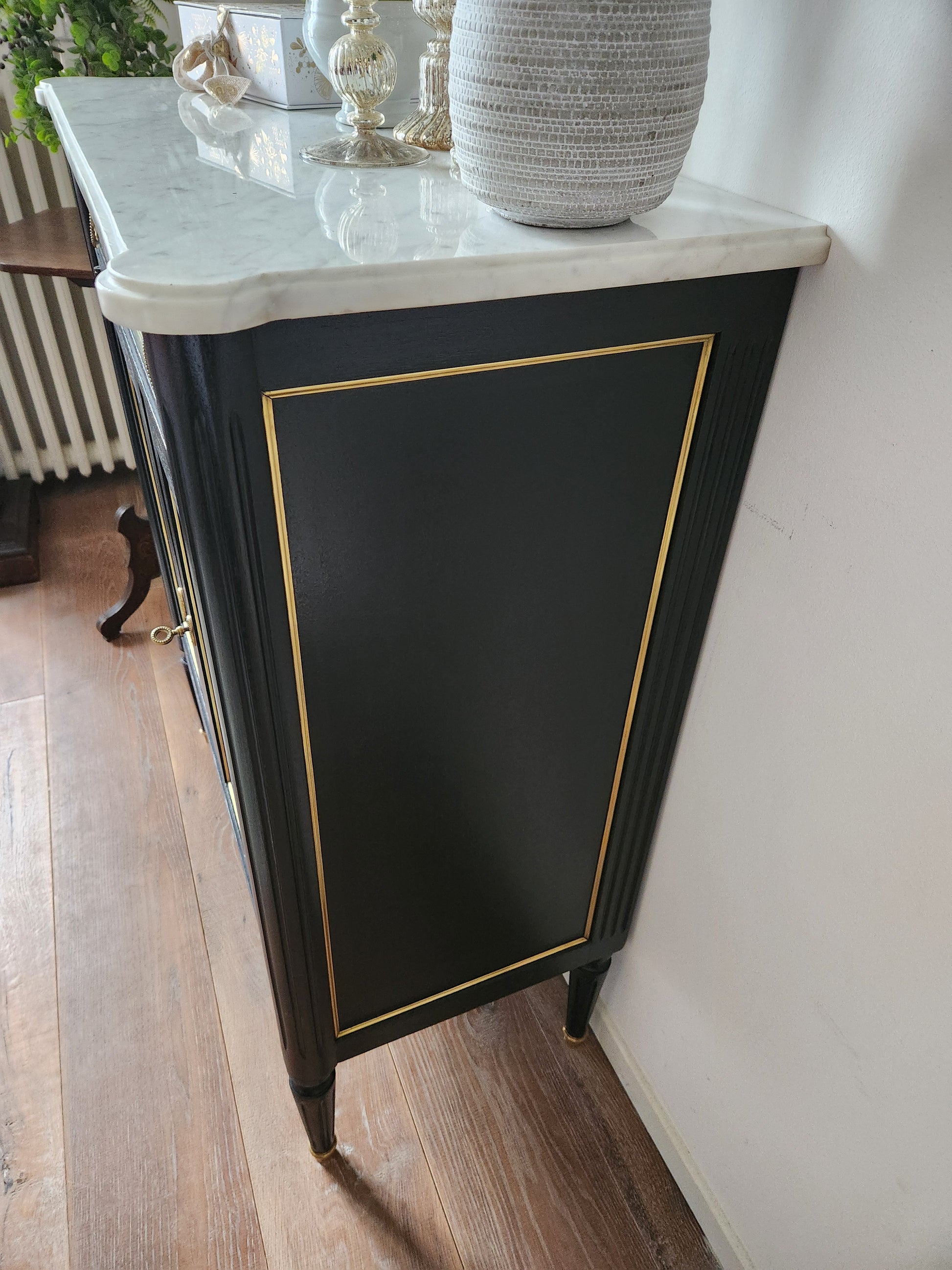 Commode buffet Louis XVI, marbre de Carrare, bronze.
