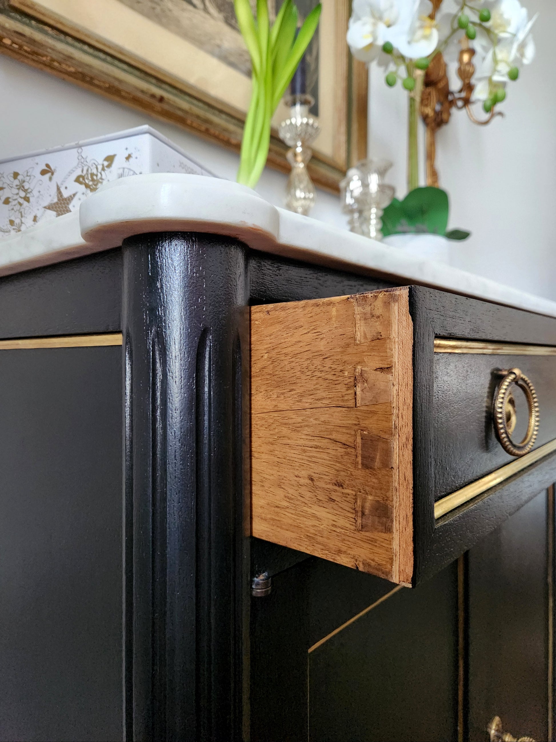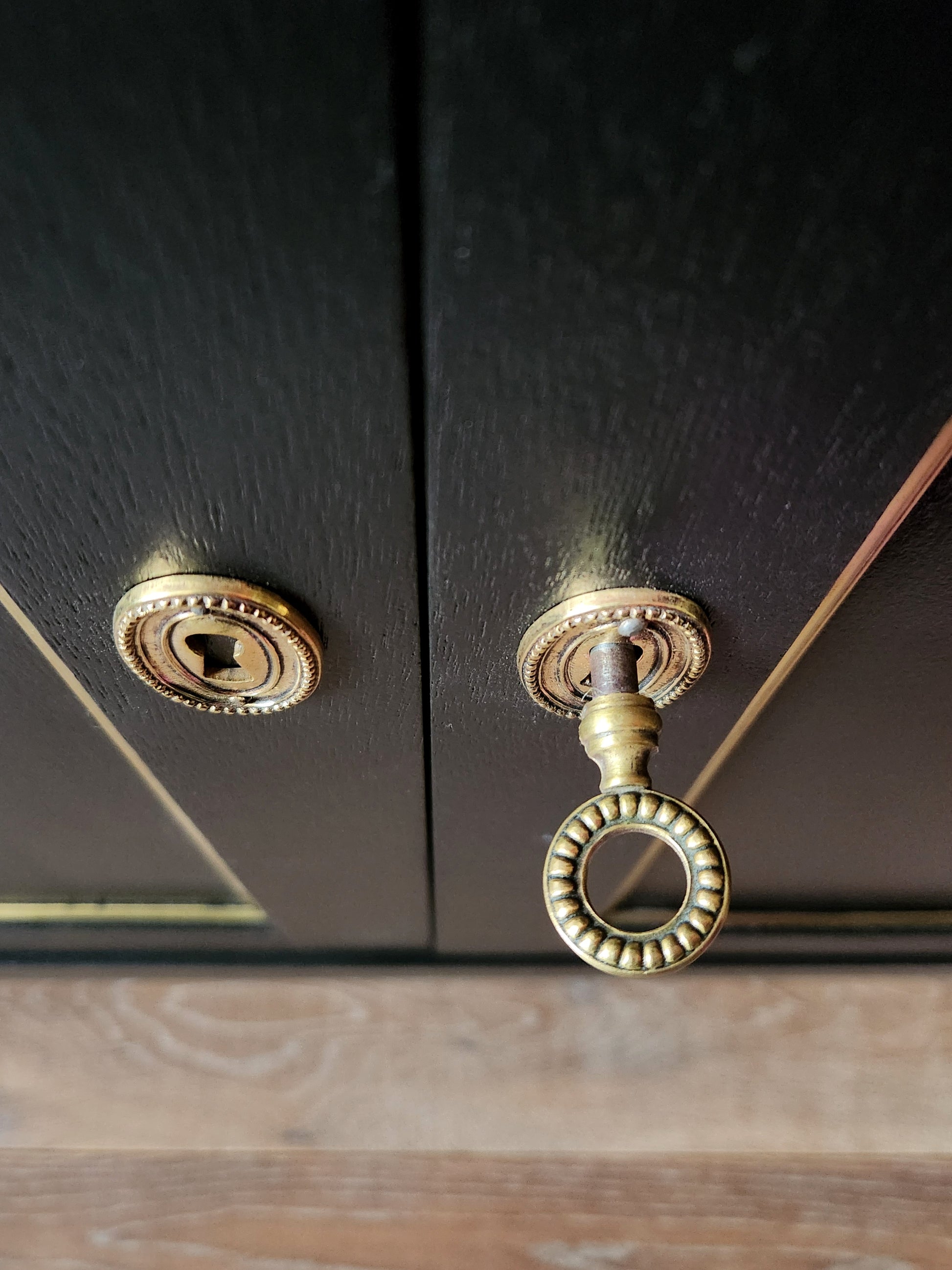 Un tiroir à queue d'arronde, deux portes, une étagère intérieure ajustable en hauteur, et deux clefs. Parfait pour créer un meuble bar à whisky dans le salon !