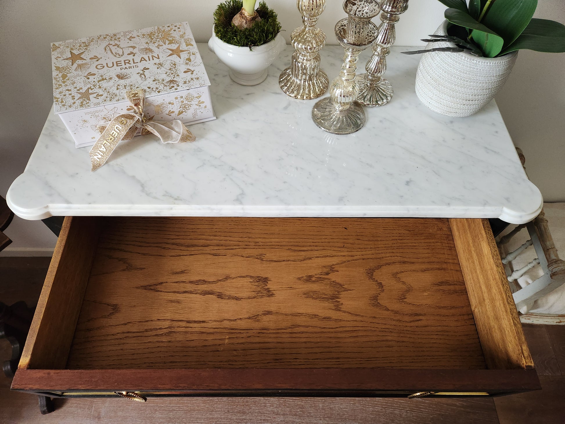 Petit buffet ancien de style Louis XVI, marbre blanc de Carrare, détails en bronze et laiton, montants terminés par des sabots en bronze doré.