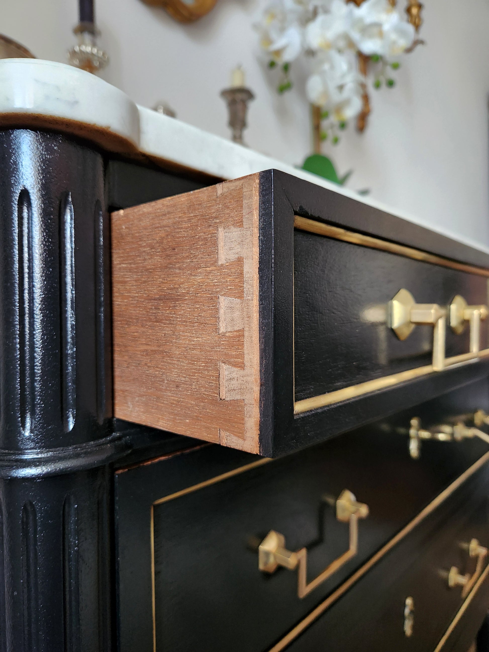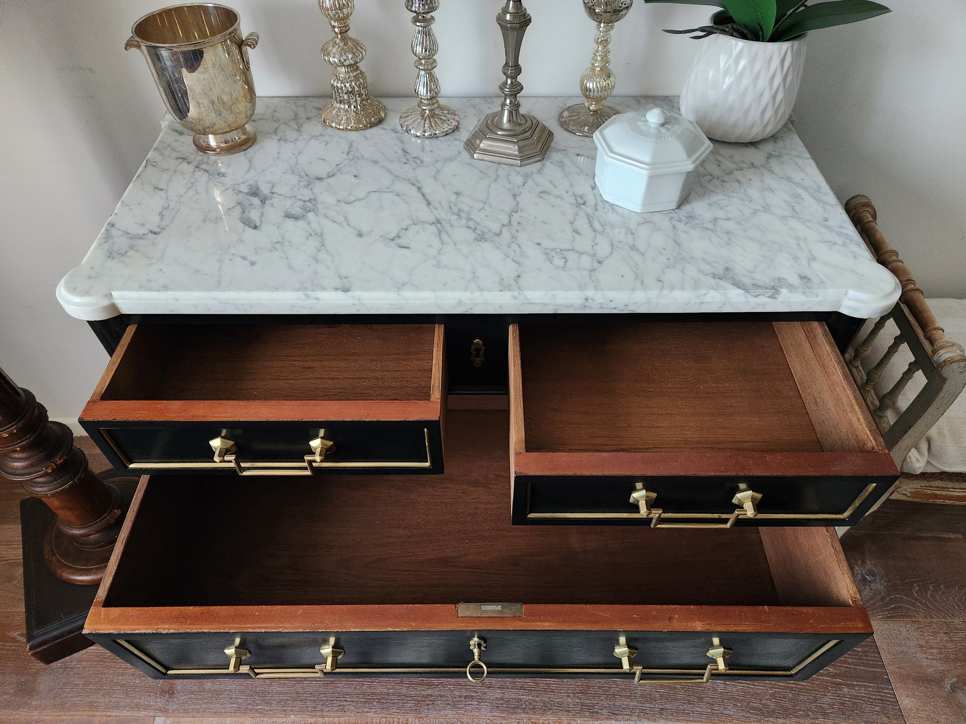 Quatre tiroirs en queue d'aronde, poignées en bronze et clef.