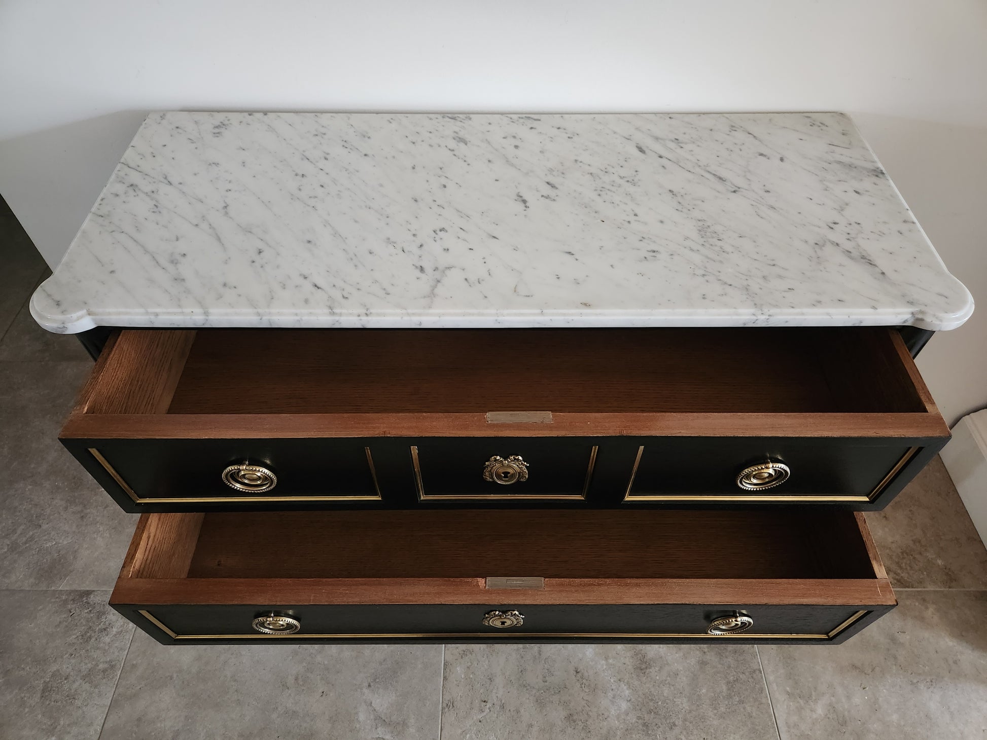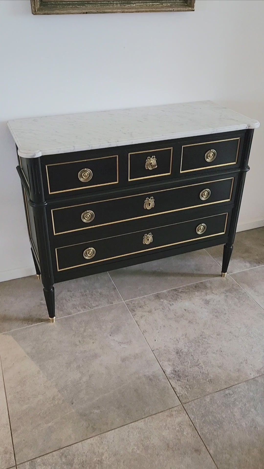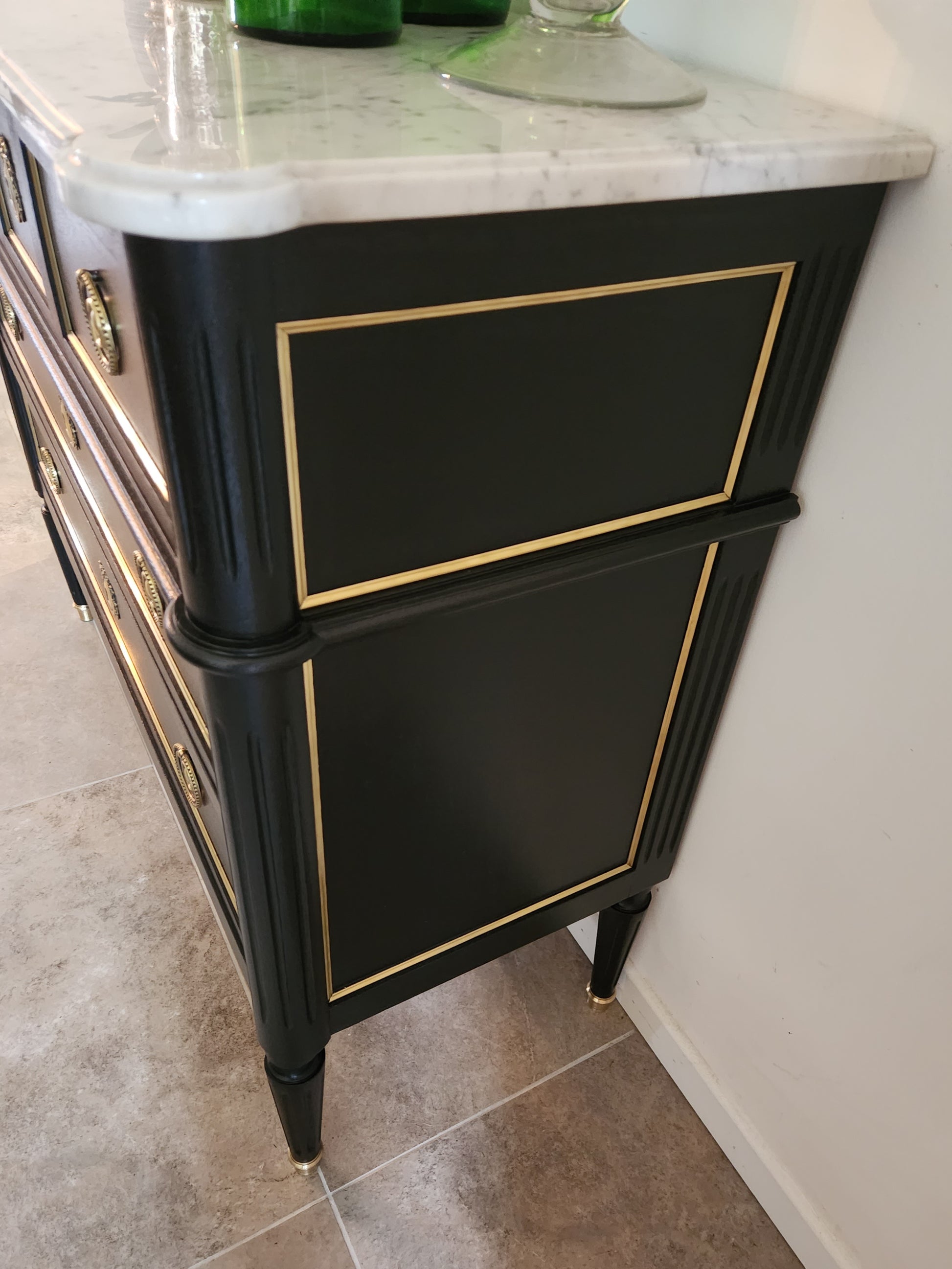 Commode ancienne de style Louis XVI surmontée d'un marbre blanc de Carrare, trois tiroirs en queue d'aronde, pieds cannelés terminés par des sabots en bronze doré.