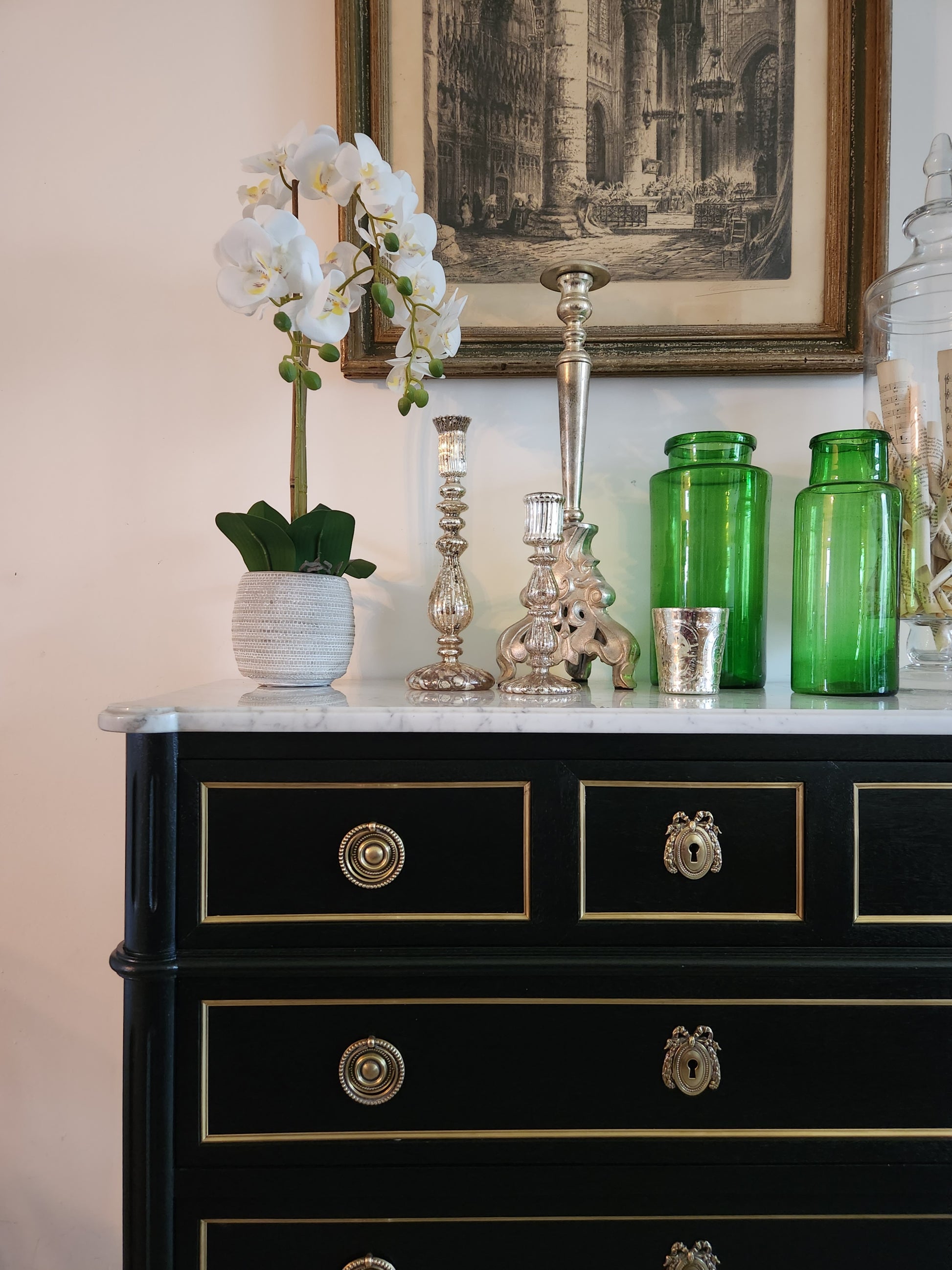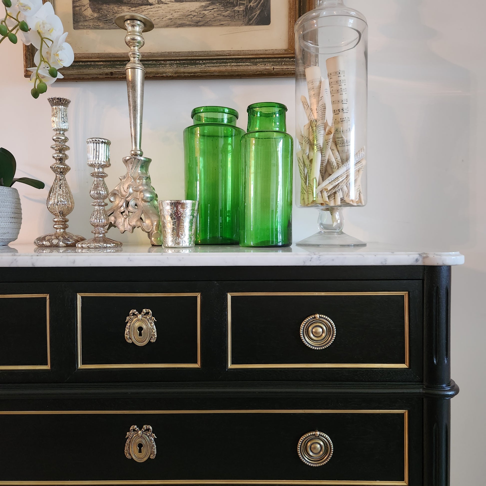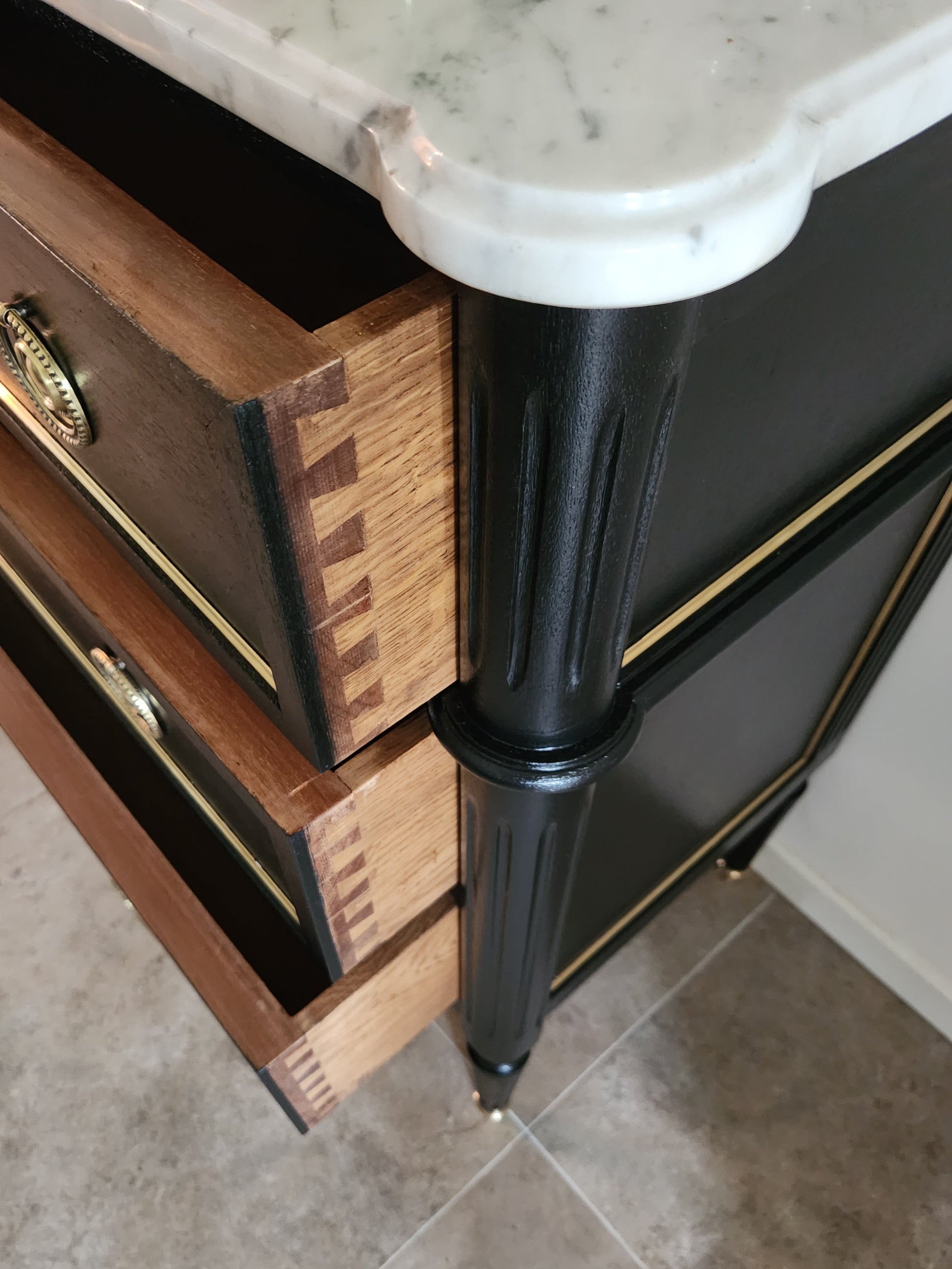 Commode ancienne de style Louis XVI surmontée d'un marbre blanc de Carrare, trois tiroirs en queue d'aronde, pieds cannelés terminés par des sabots en bronze doré.