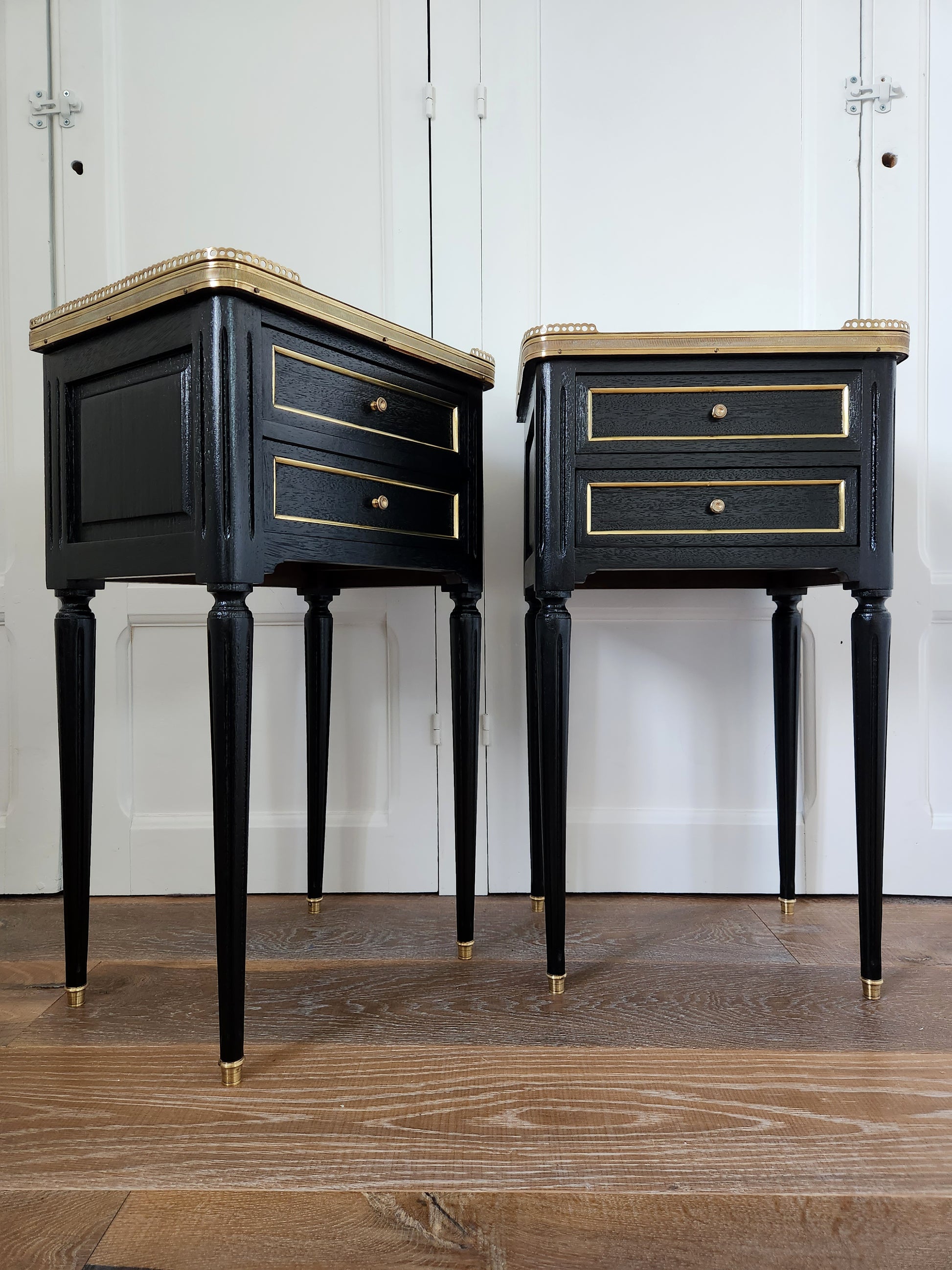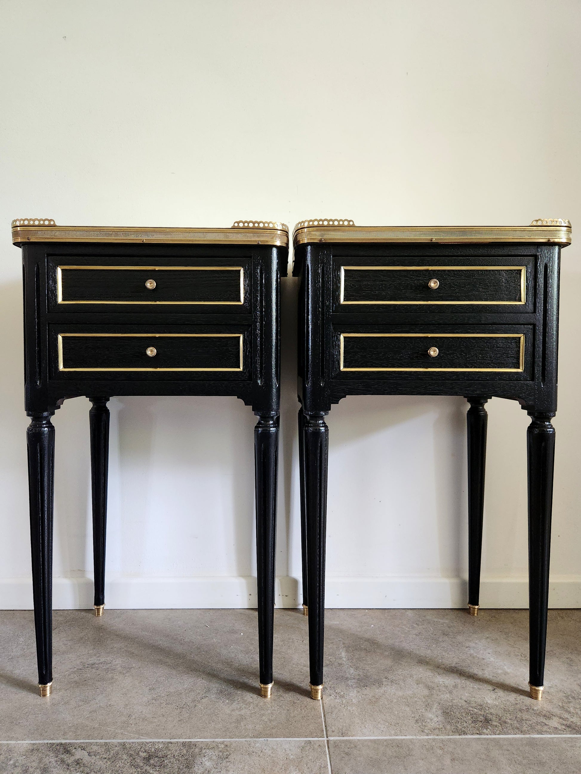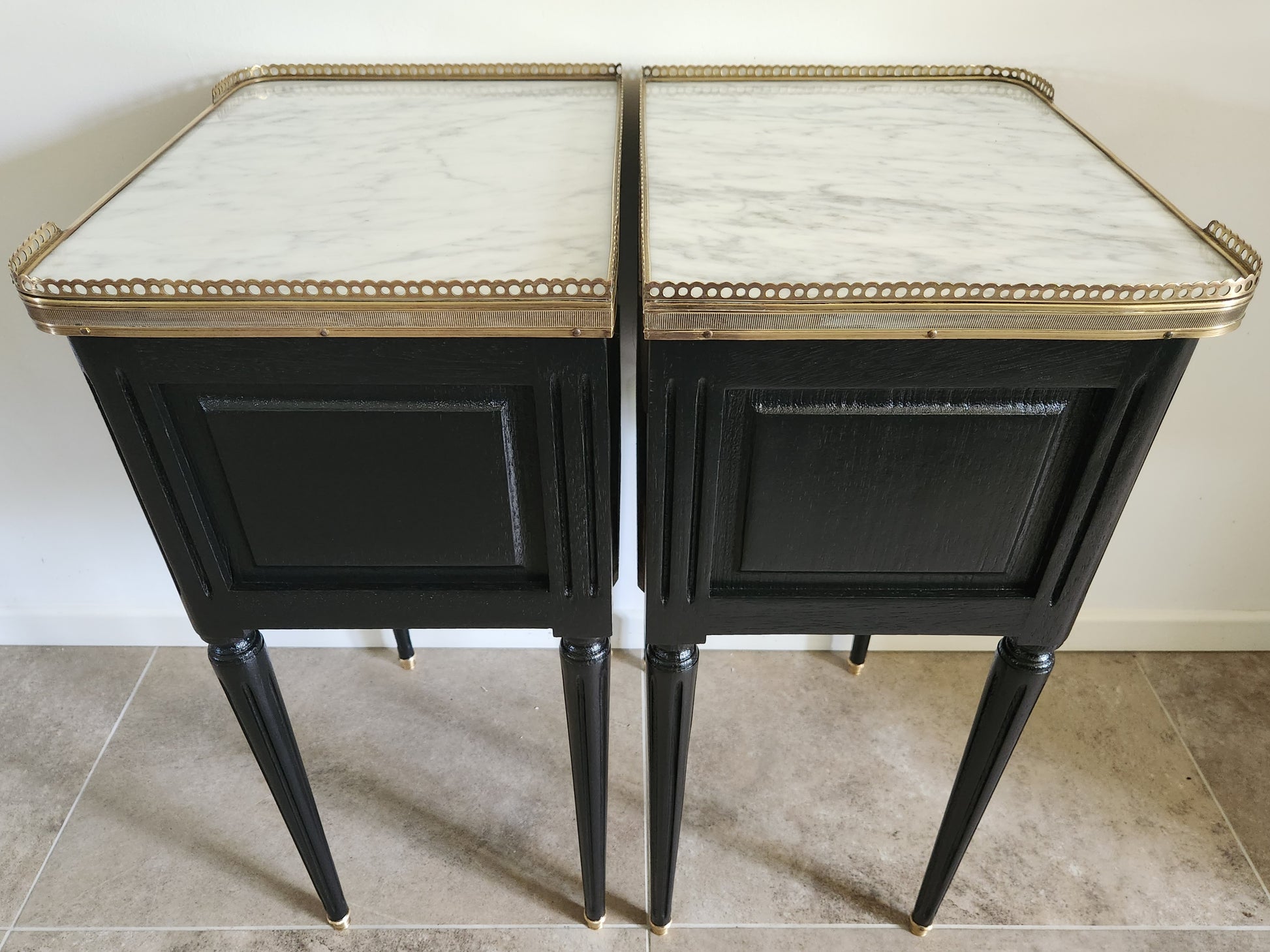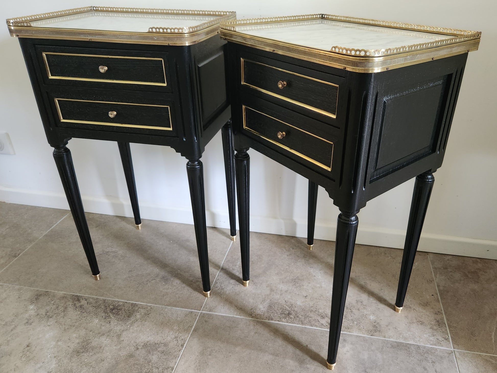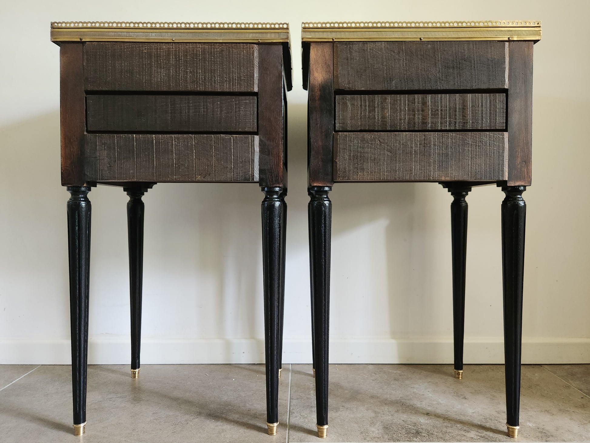 Paire de chevets ou tables d'appoint de style Louis XVI, surmontée de marbres de carrare encadrés d'une galerie ajourée en laiton, pieds cannelés terminés par des sabots de bronze doré, 2 tiroirs.
