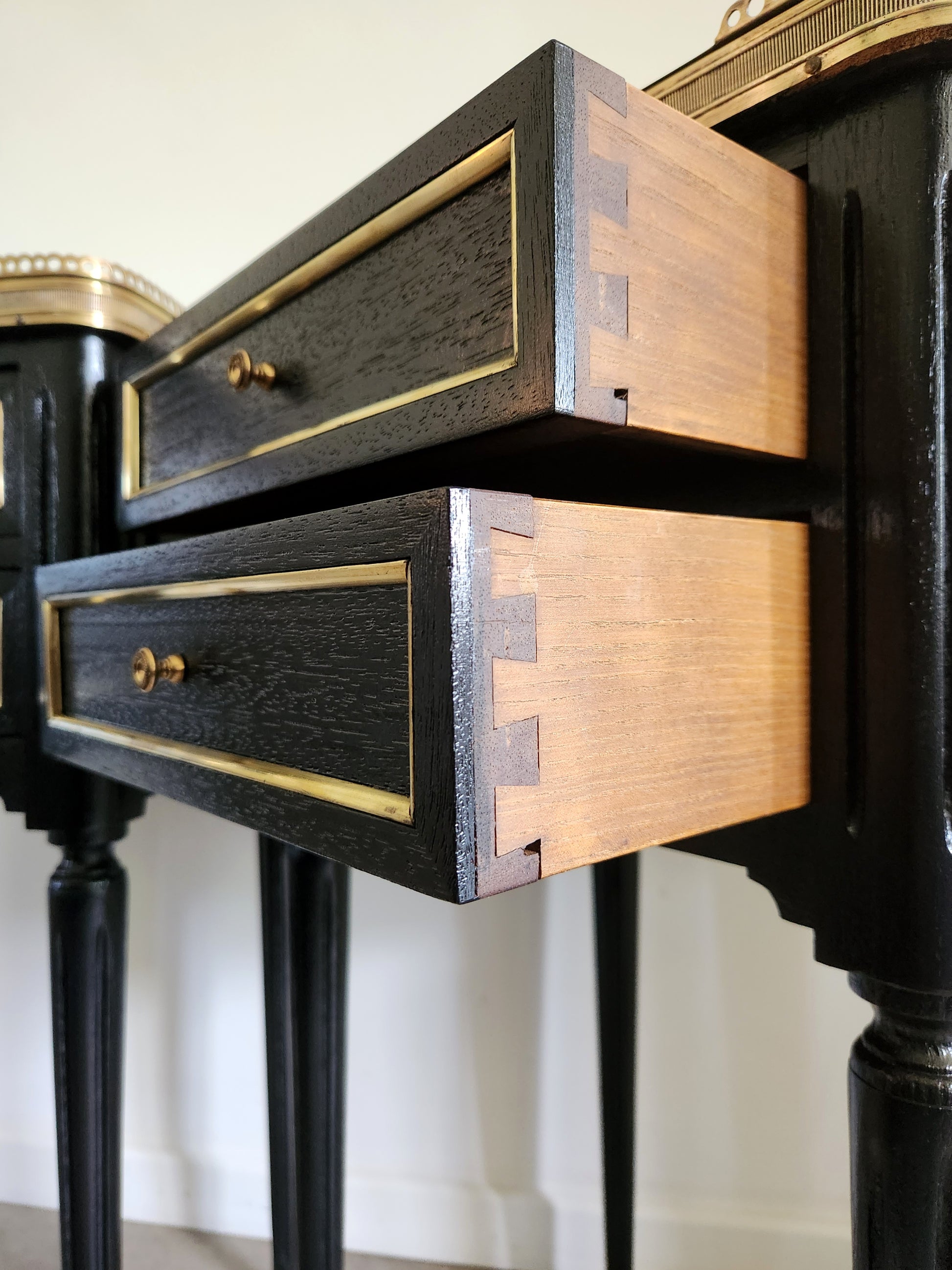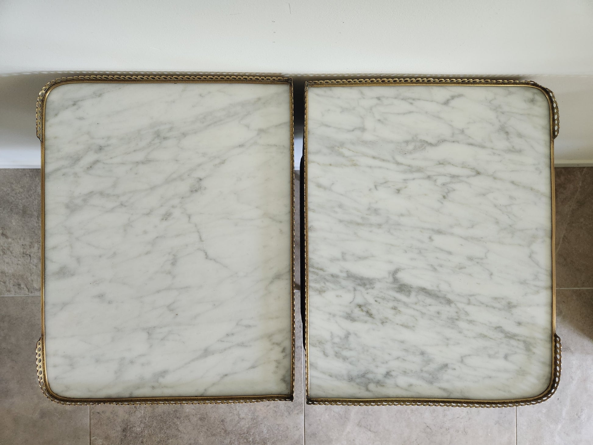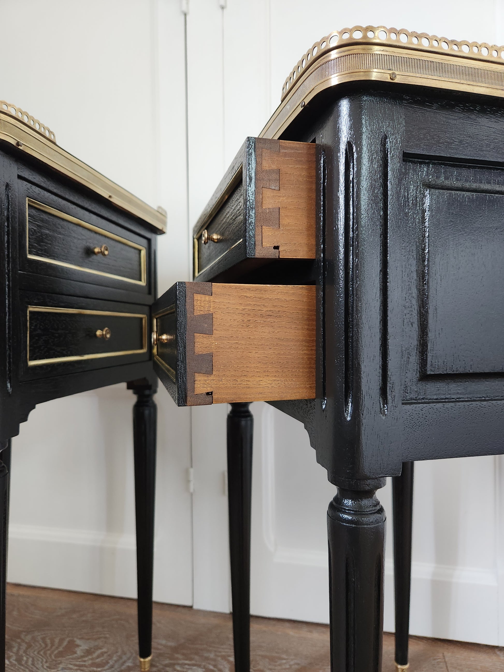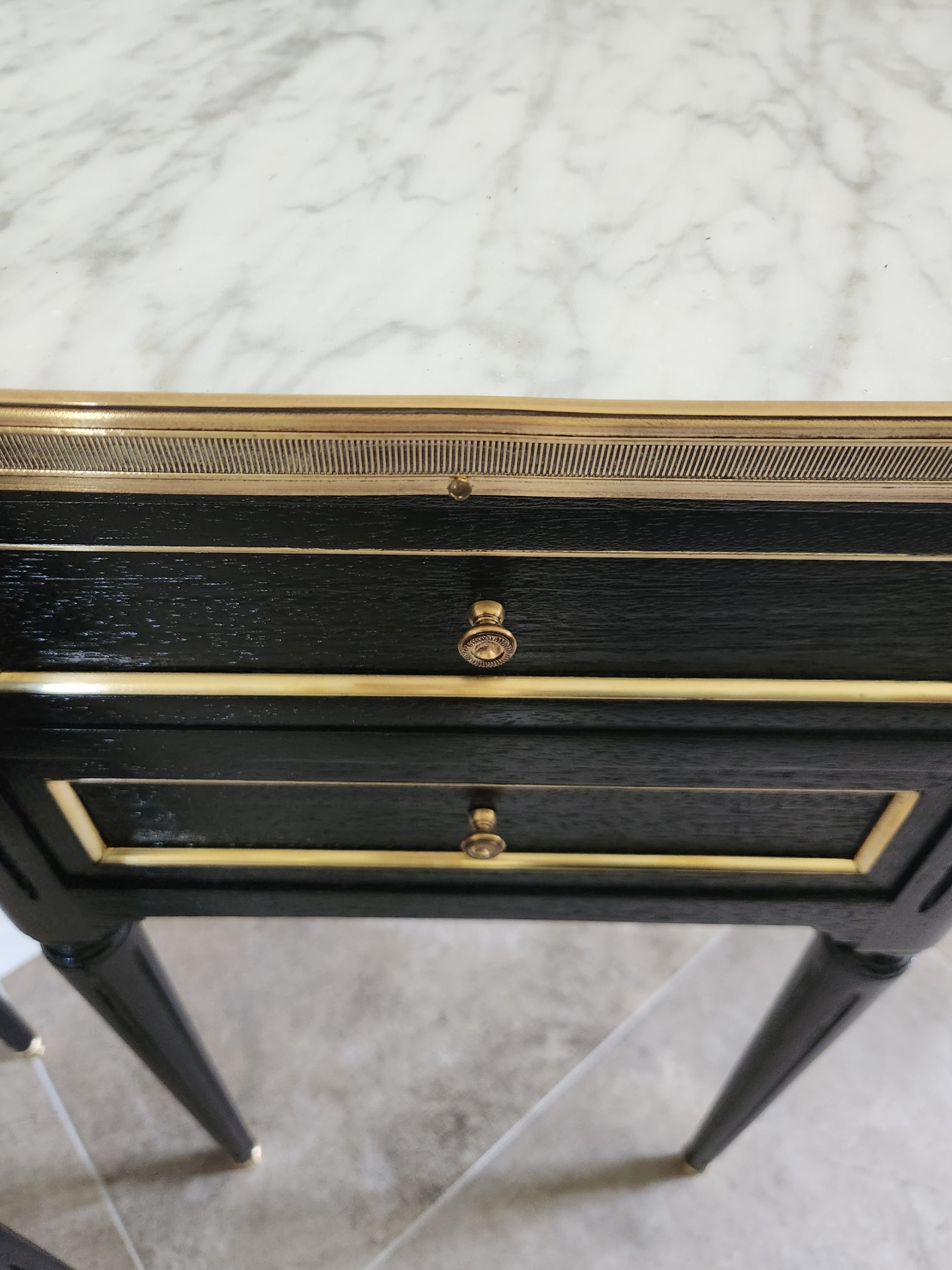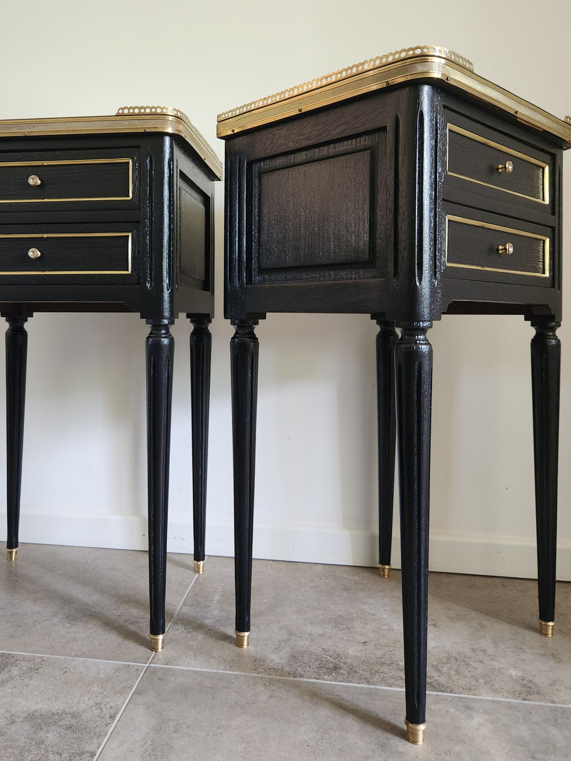 Paire de chevets ou tables d'appoint de style Louis XVI, surmontée de marbres de carrare encadrés d'une galerie ajourée en laiton, pieds cannelés terminés par des sabots de bronze doré, 2 tiroirs.