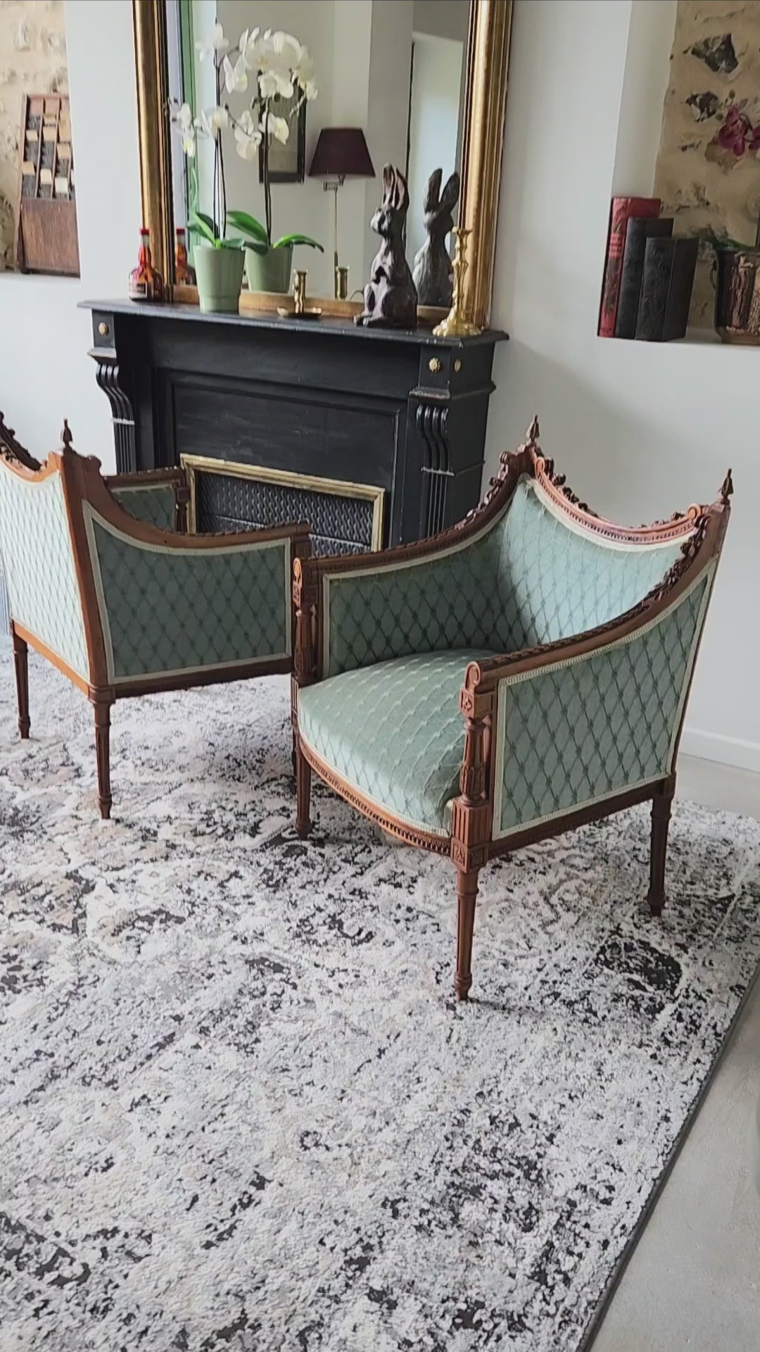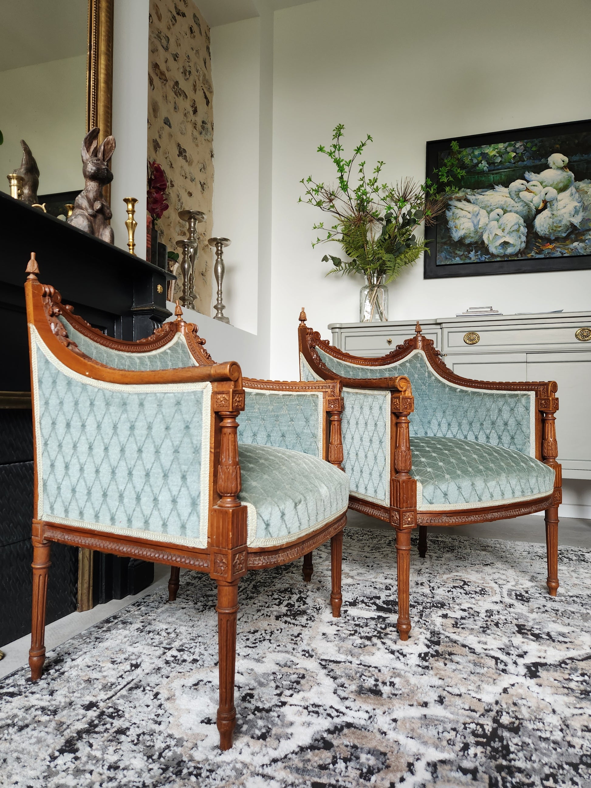 Superbe paire de fauteuils Louis XVI en noyer sculpté, structure en très bon état, tissu en velours de laine ancien travaillé en losanges terminé par un galon.