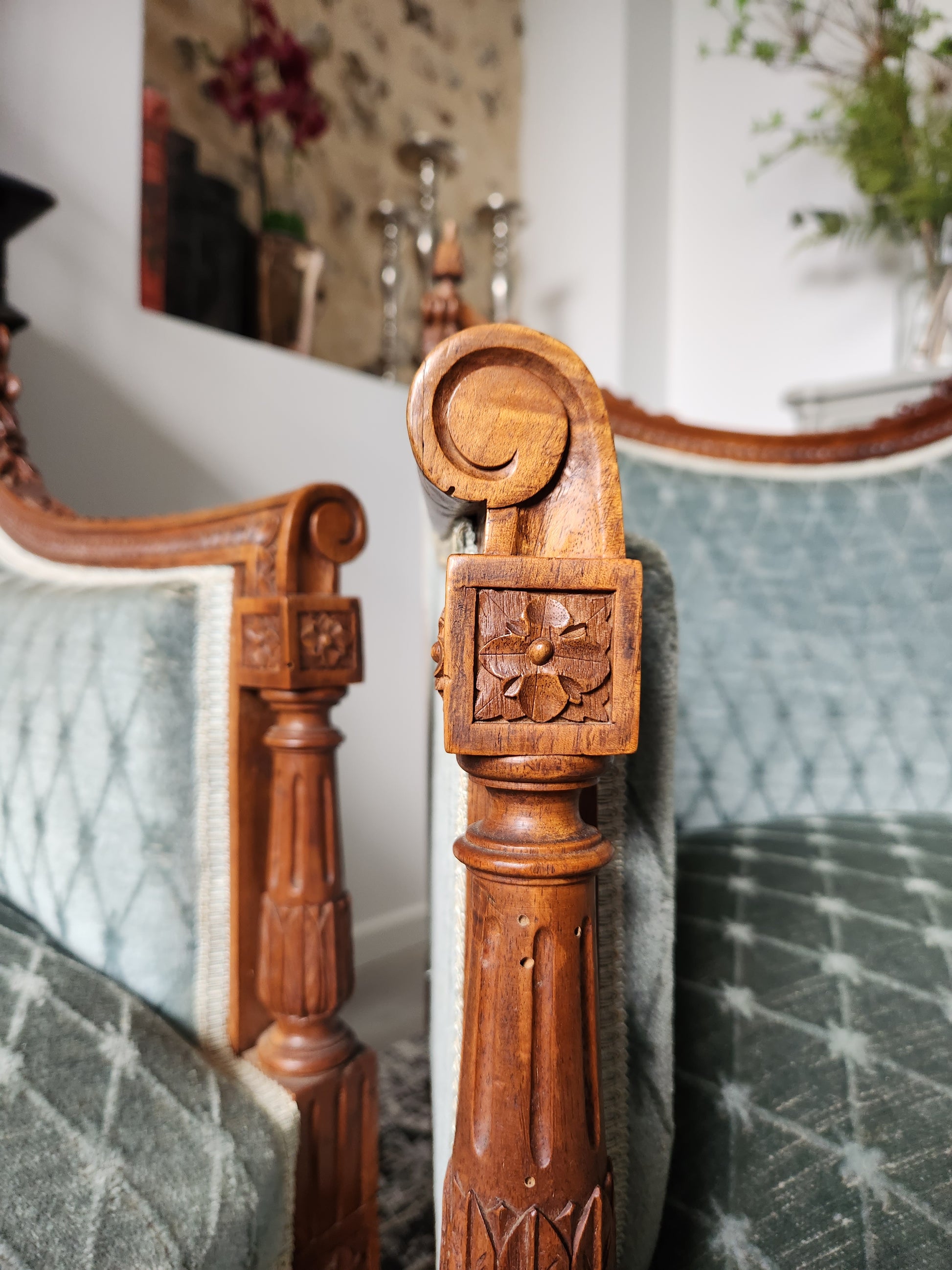 Les accoudoirs reposent sur une colonne sculptée qui prolonge les pieds cannelés. Les sièges dodus sont extrêmement confortables grâce aux ressorts qui vous incitent à vous reposer, et les côtés et le dossier sont également rembourrés.