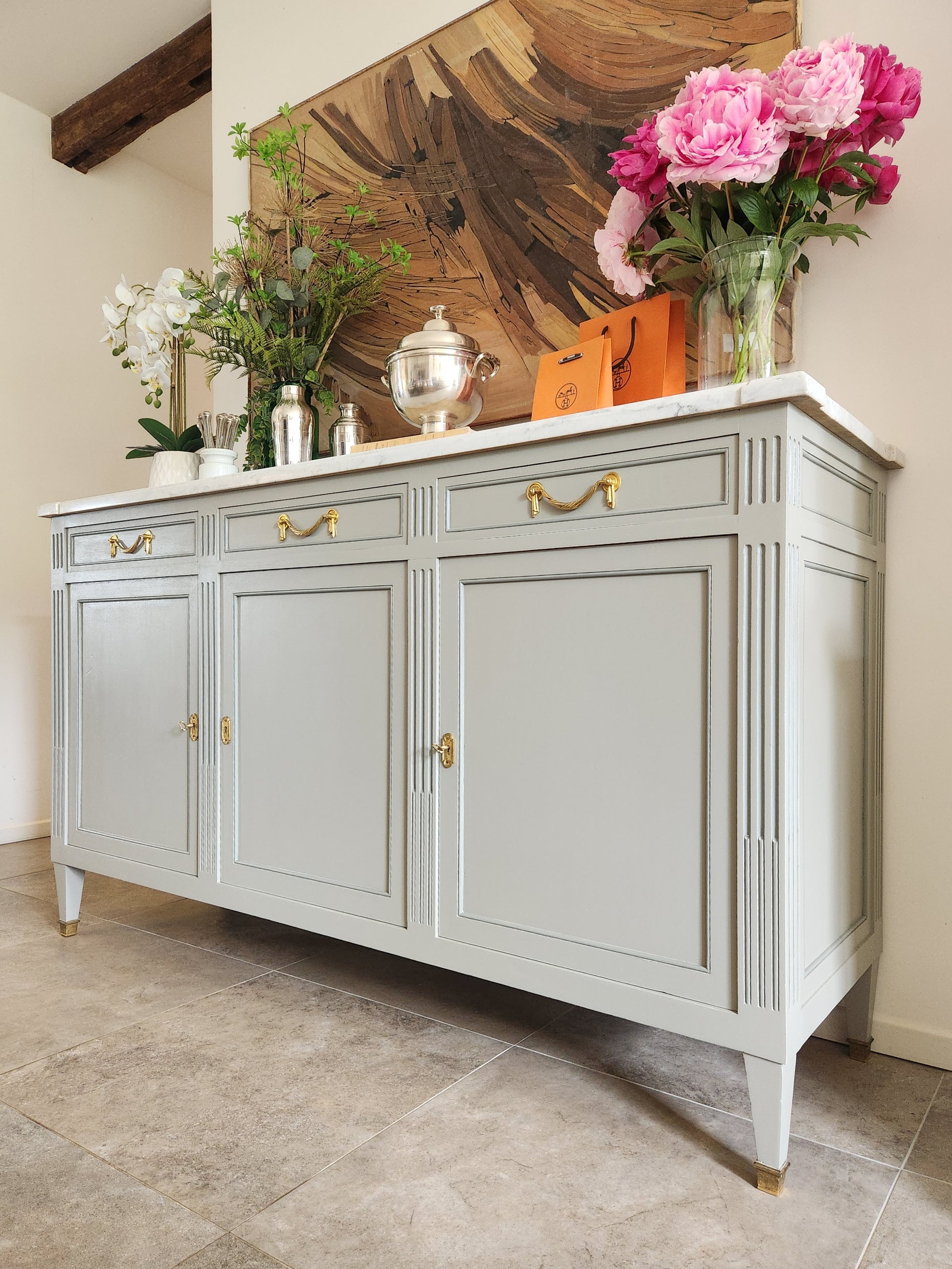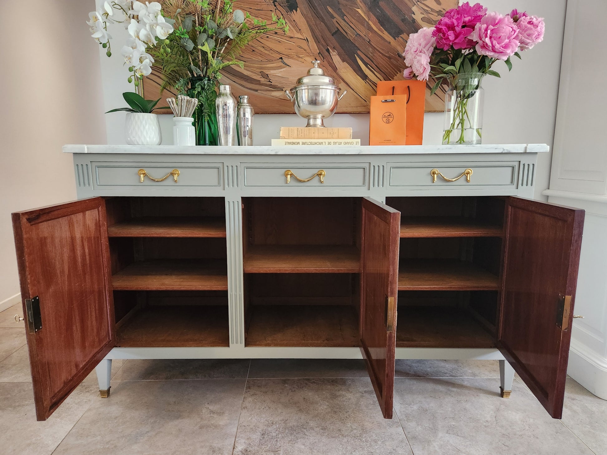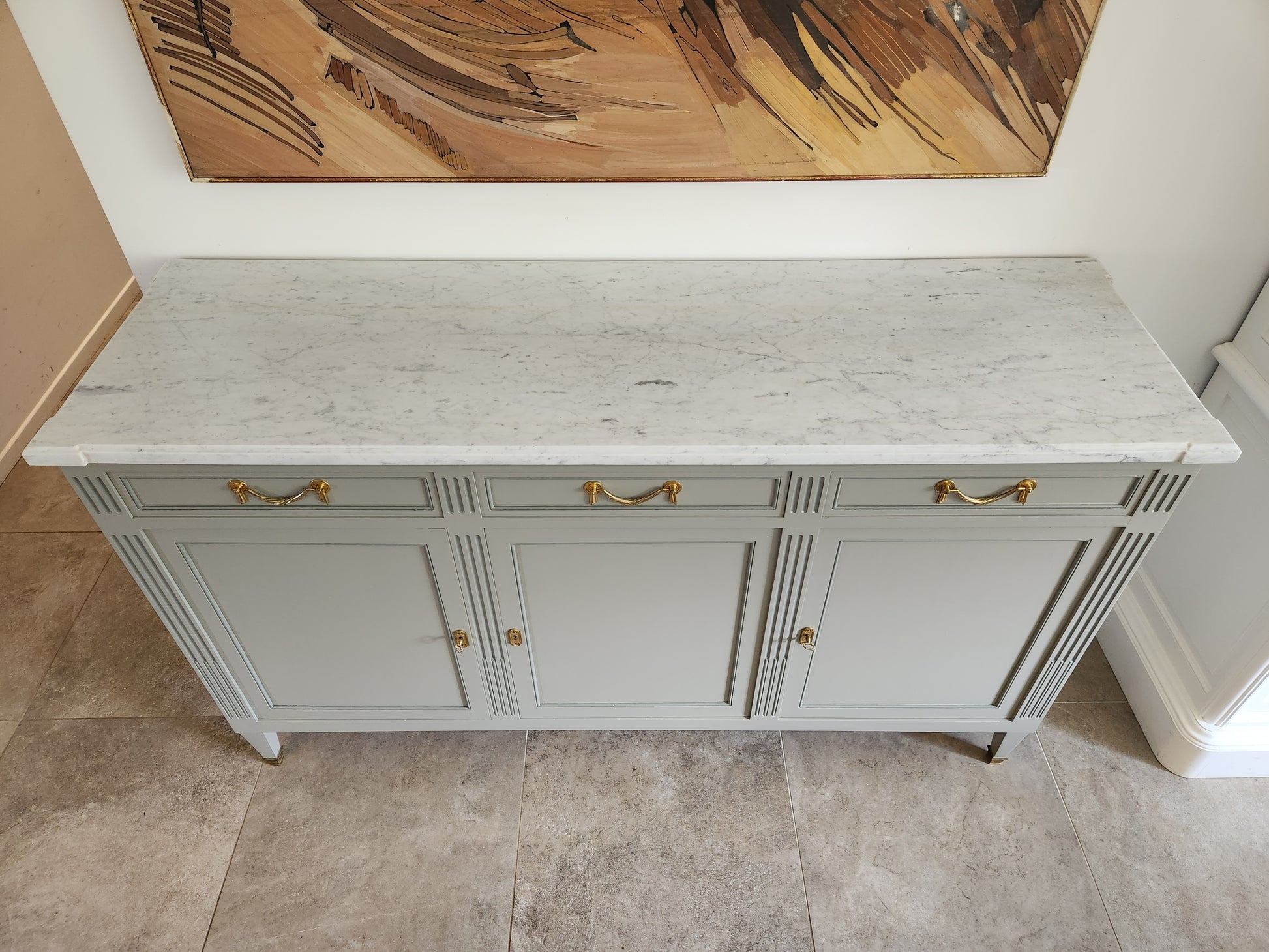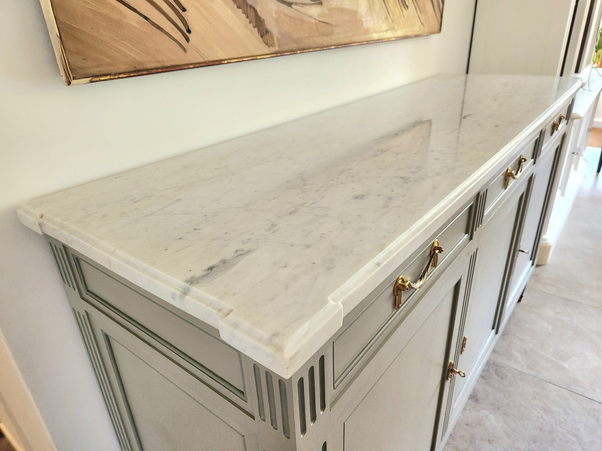 Buffet Louis XVI, marbre de Carrare, détails bronze.