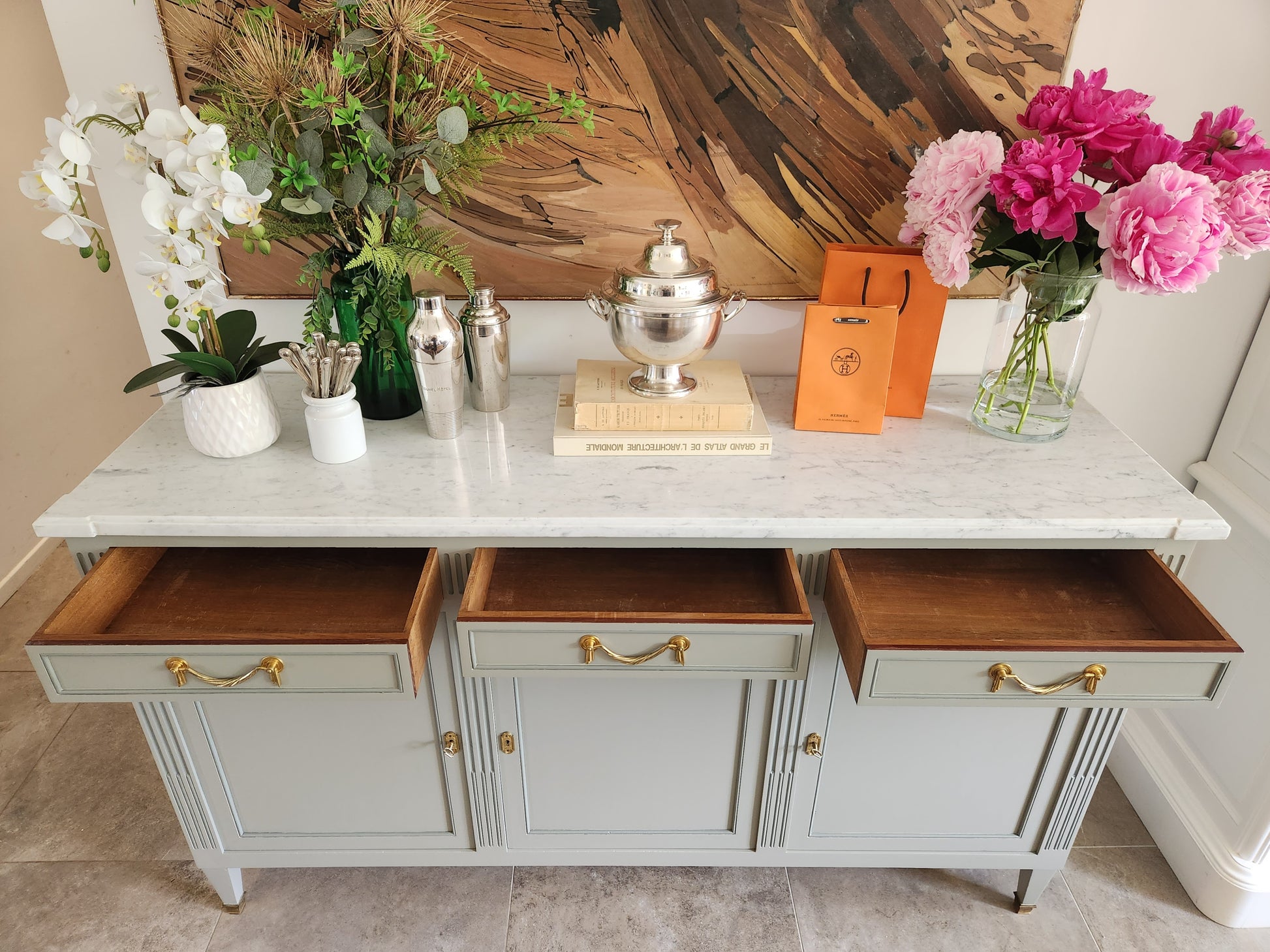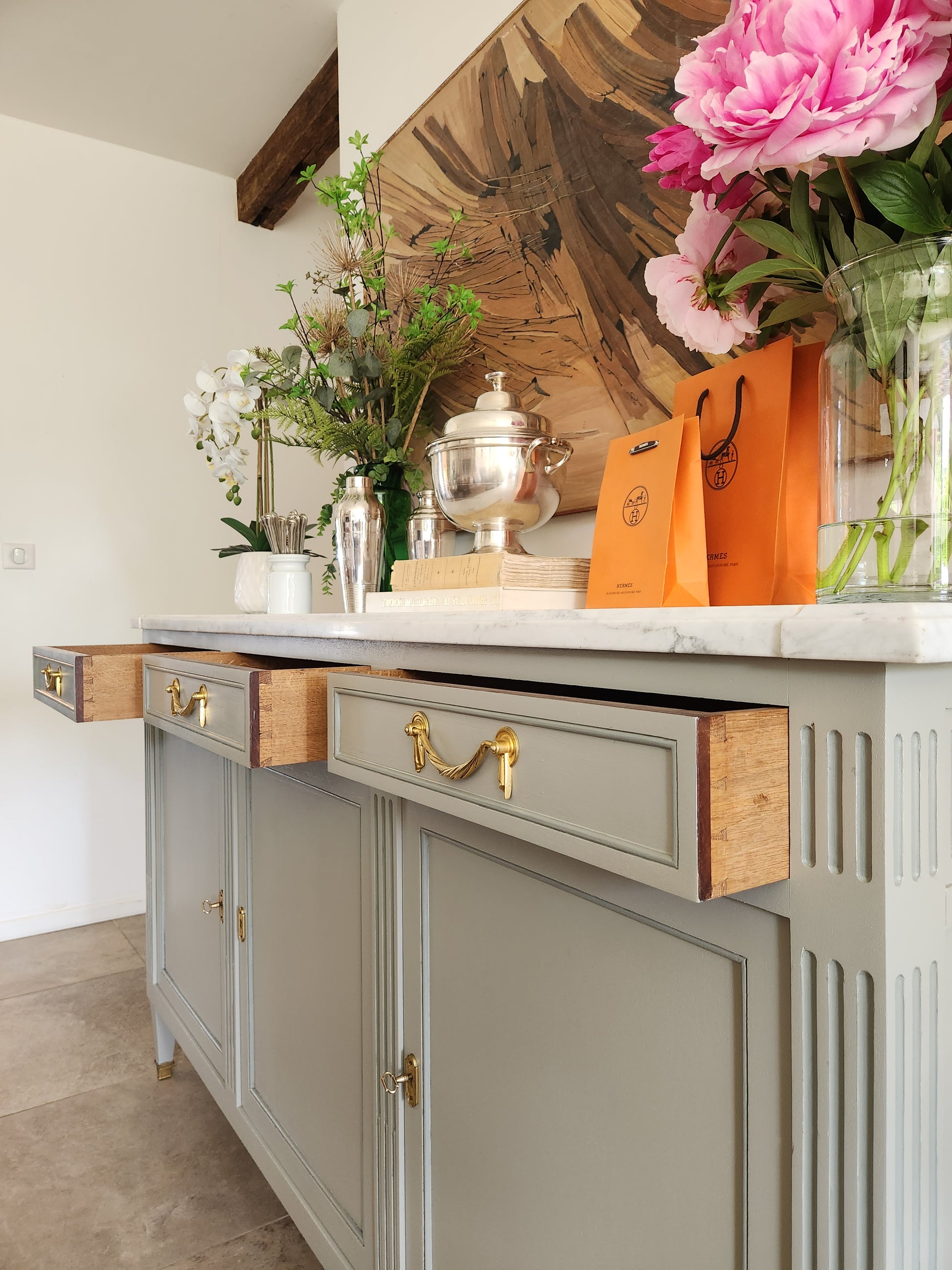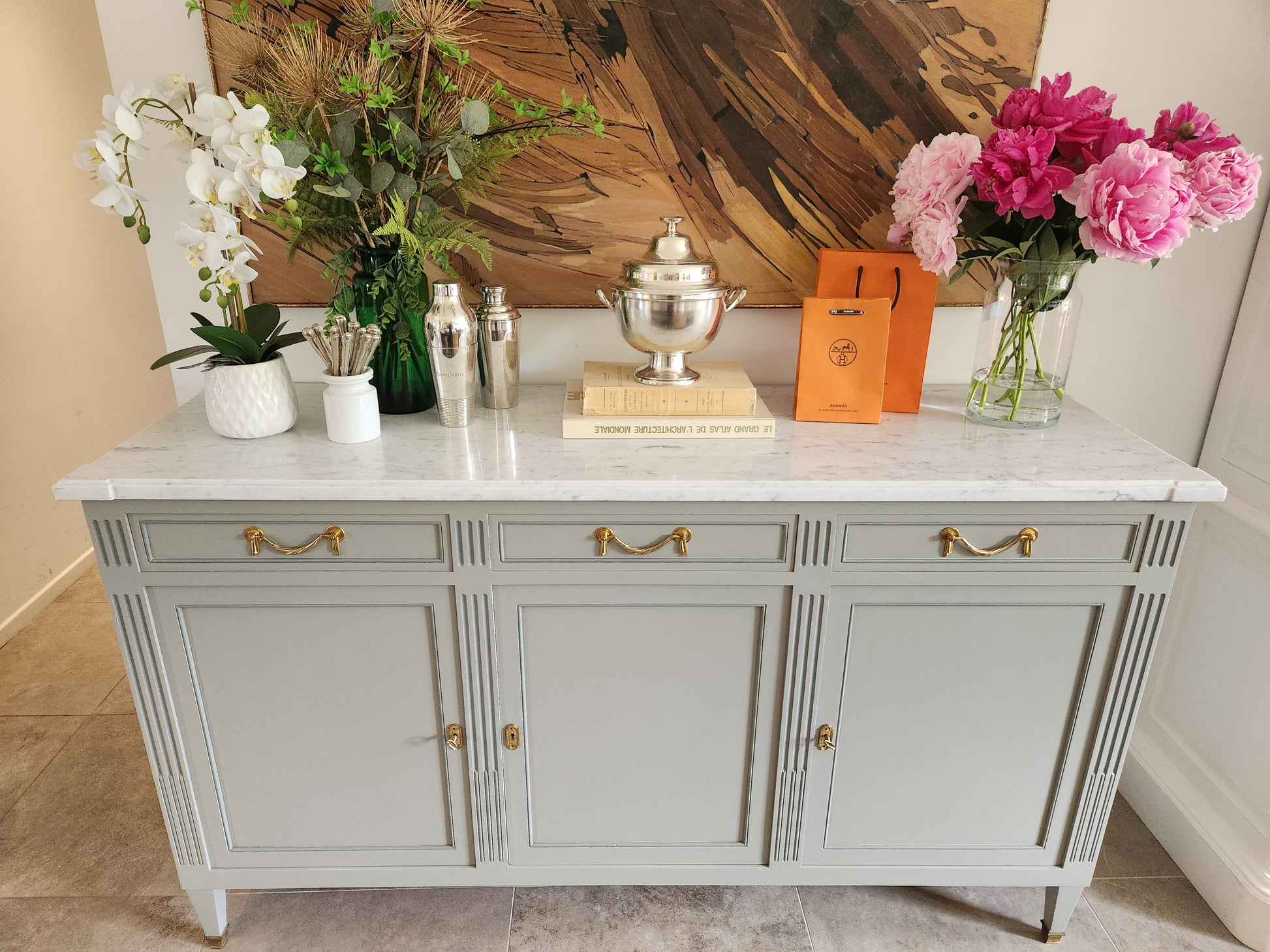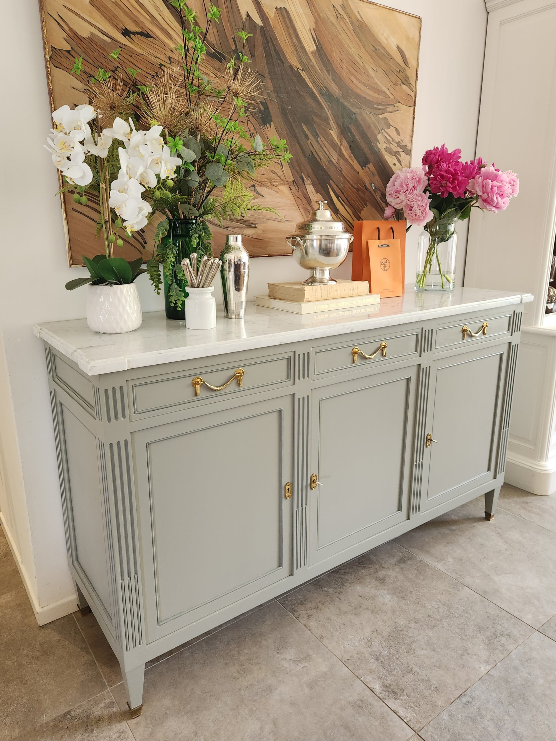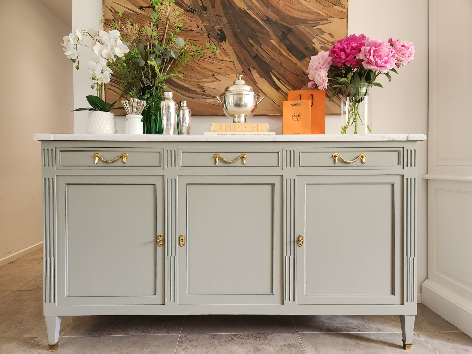 Buffet Louis XVI, marbre de Carrare, détails bronze.