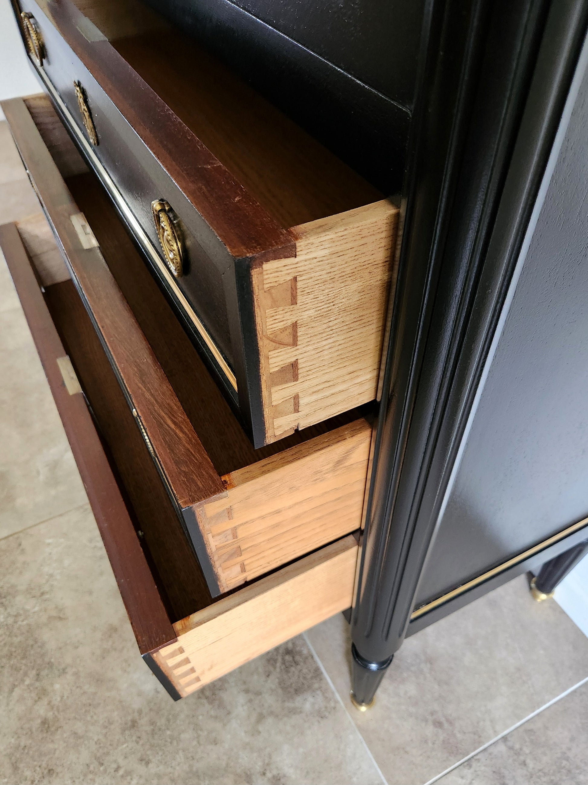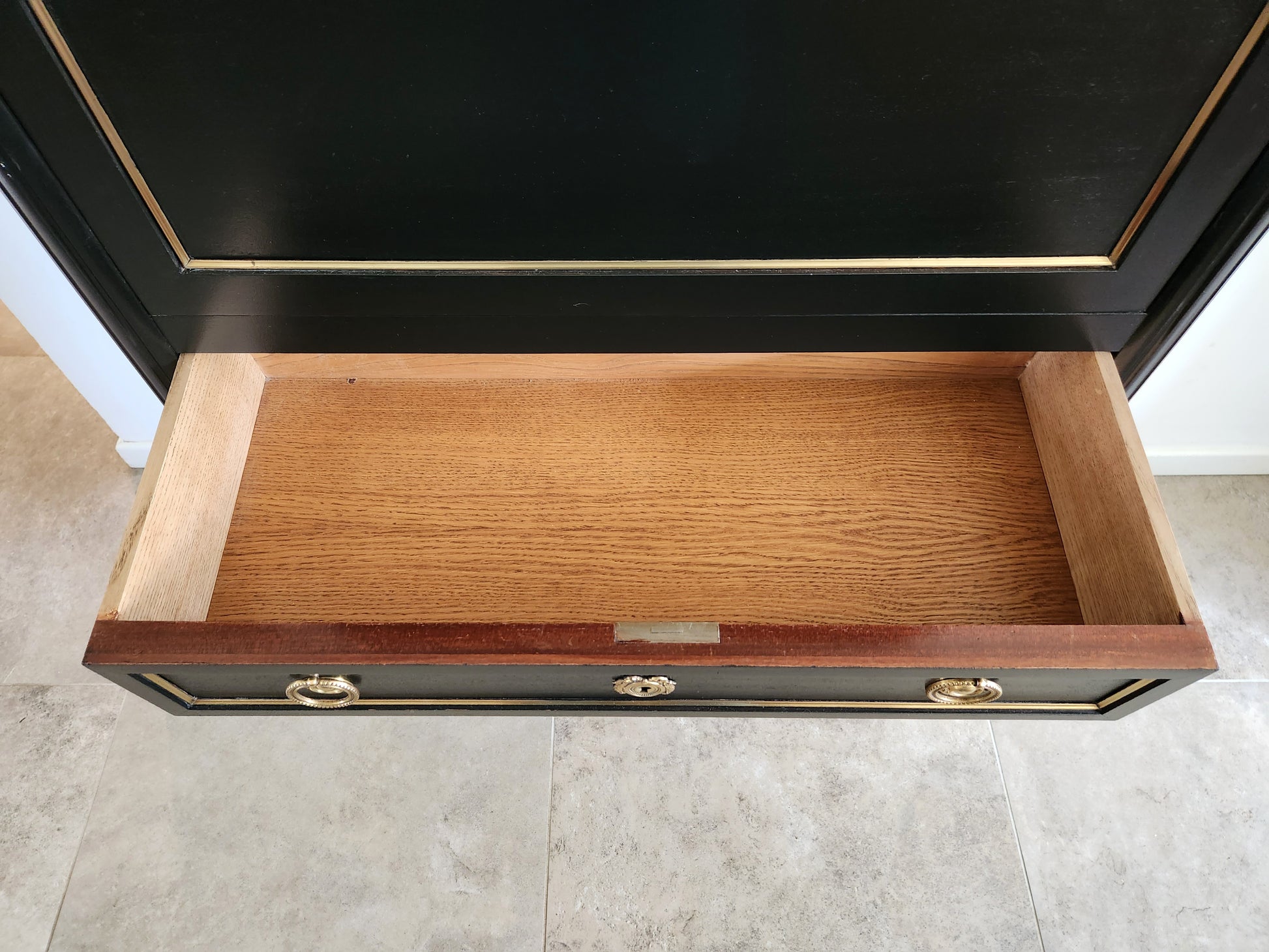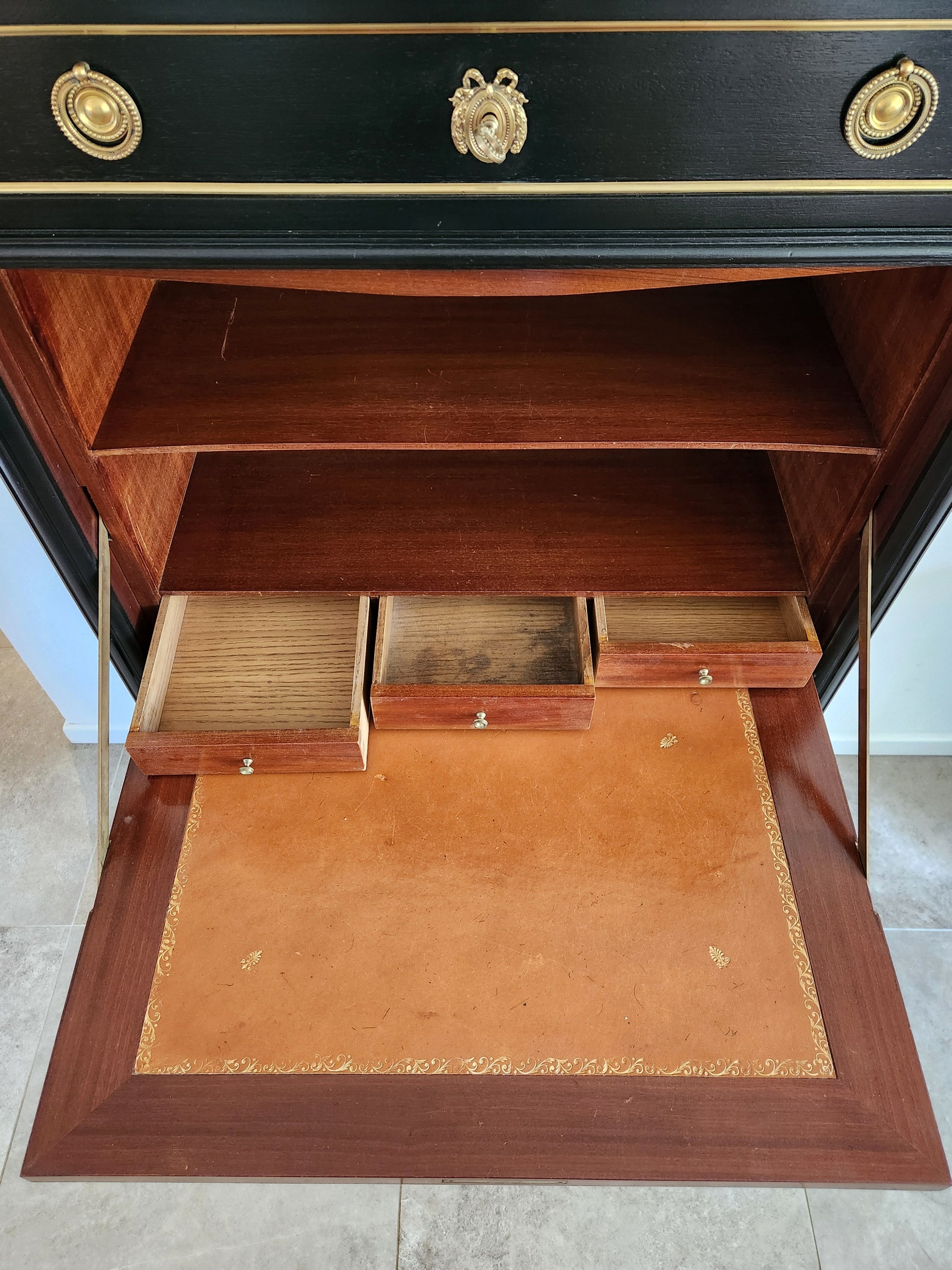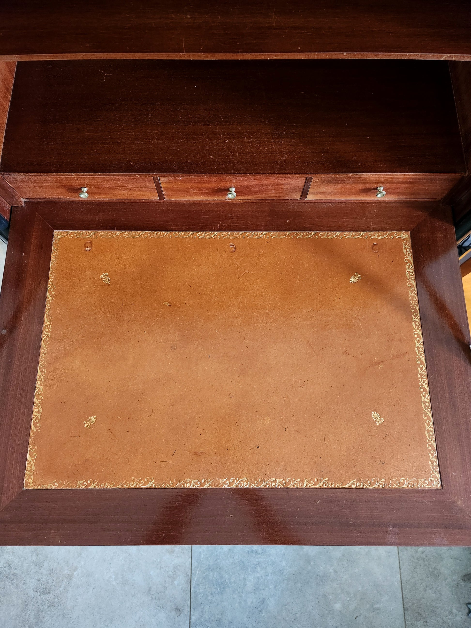 Quatre tiroirs en queue d'aronde, un abbattant central s'ouvre sur un espace d'écriture composé d'un plateau en cuir cognac, de trois petits tiroirs et d'un espace de rangement.