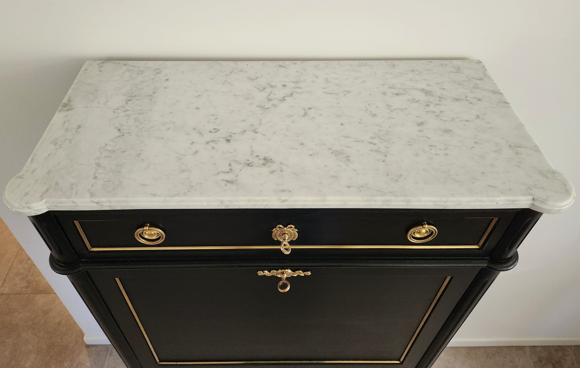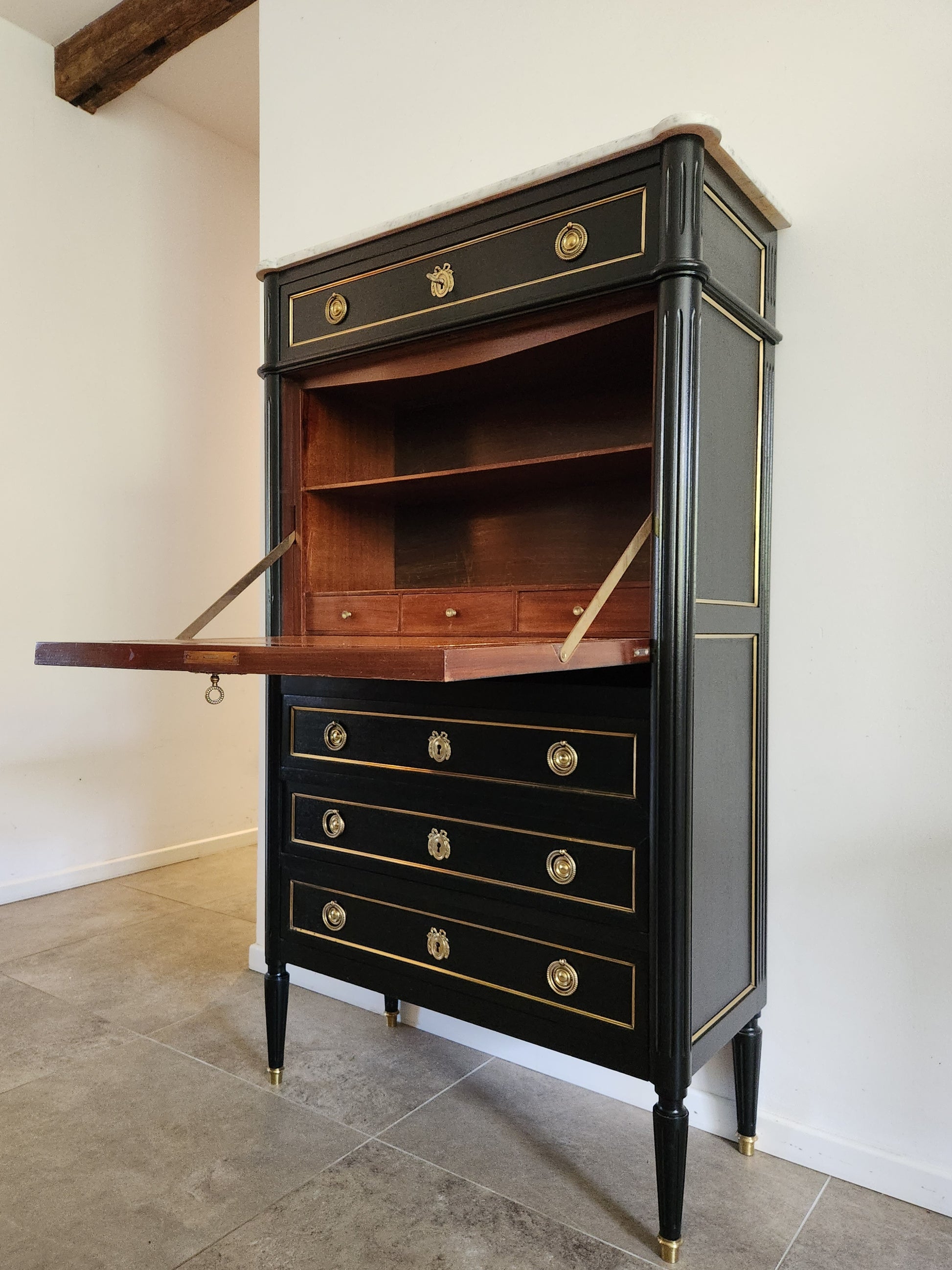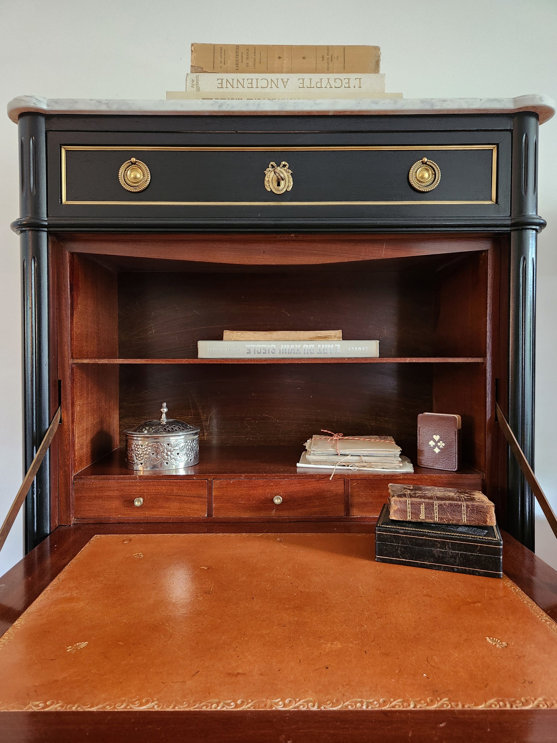 Secrétaire de style Louis XVI surmonté d'un marbre de Carrare, pieds cannelés terminés par des sabots en bronze doré. Détails en laiton sur toutes les faces.