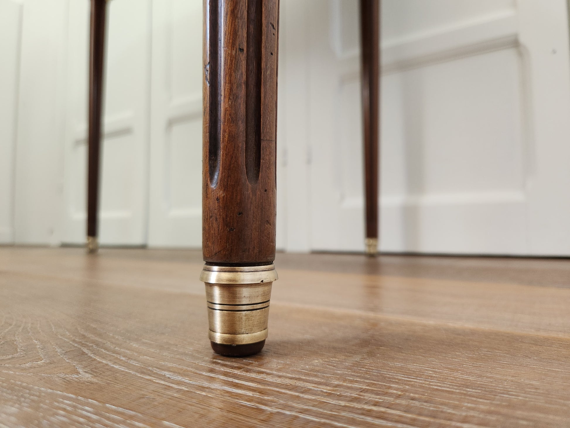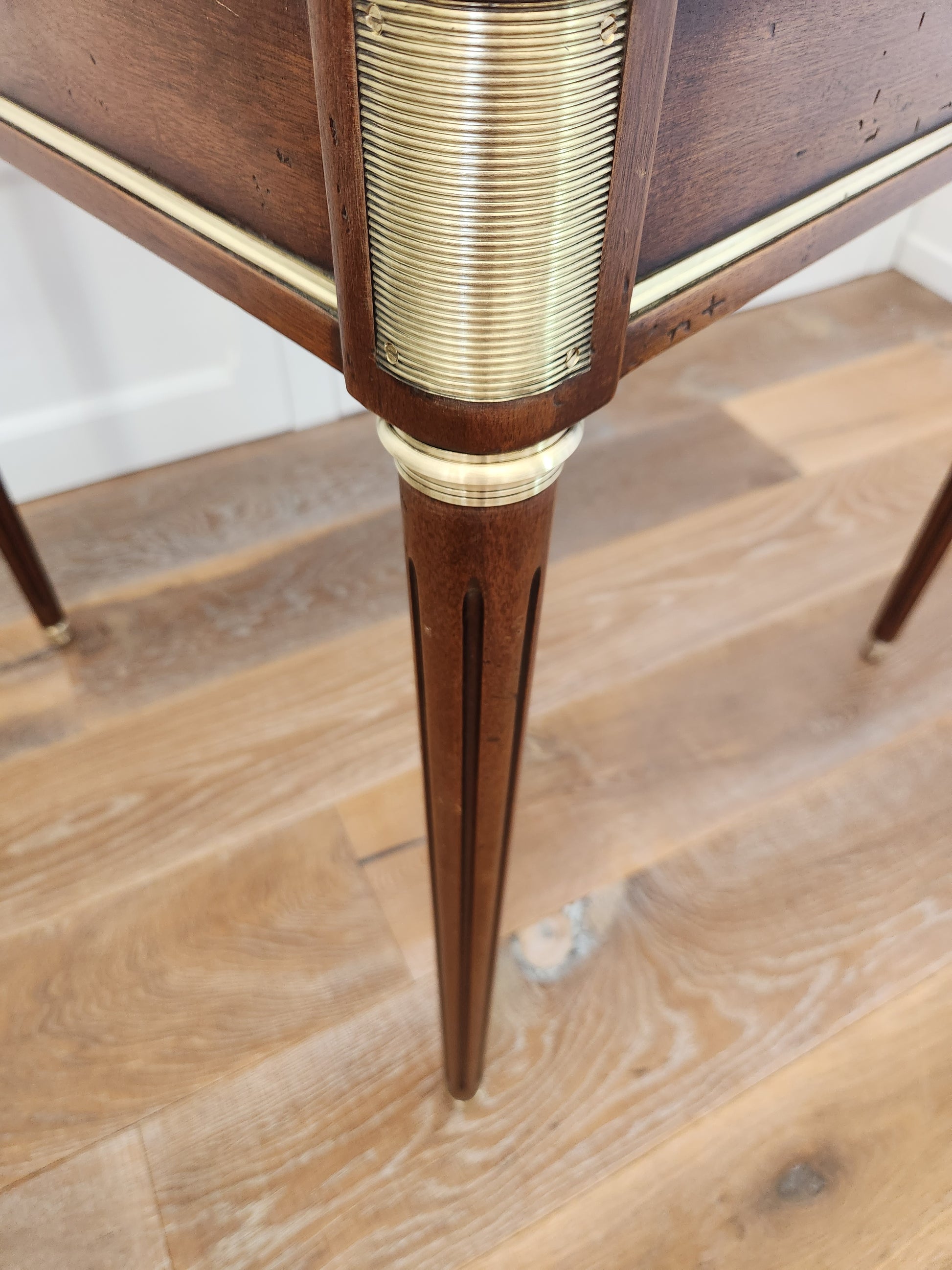 A chaque coin du plateau des emplacements pour les verres. Montants cannelés décorés de bagues et sabots en bronze doré.