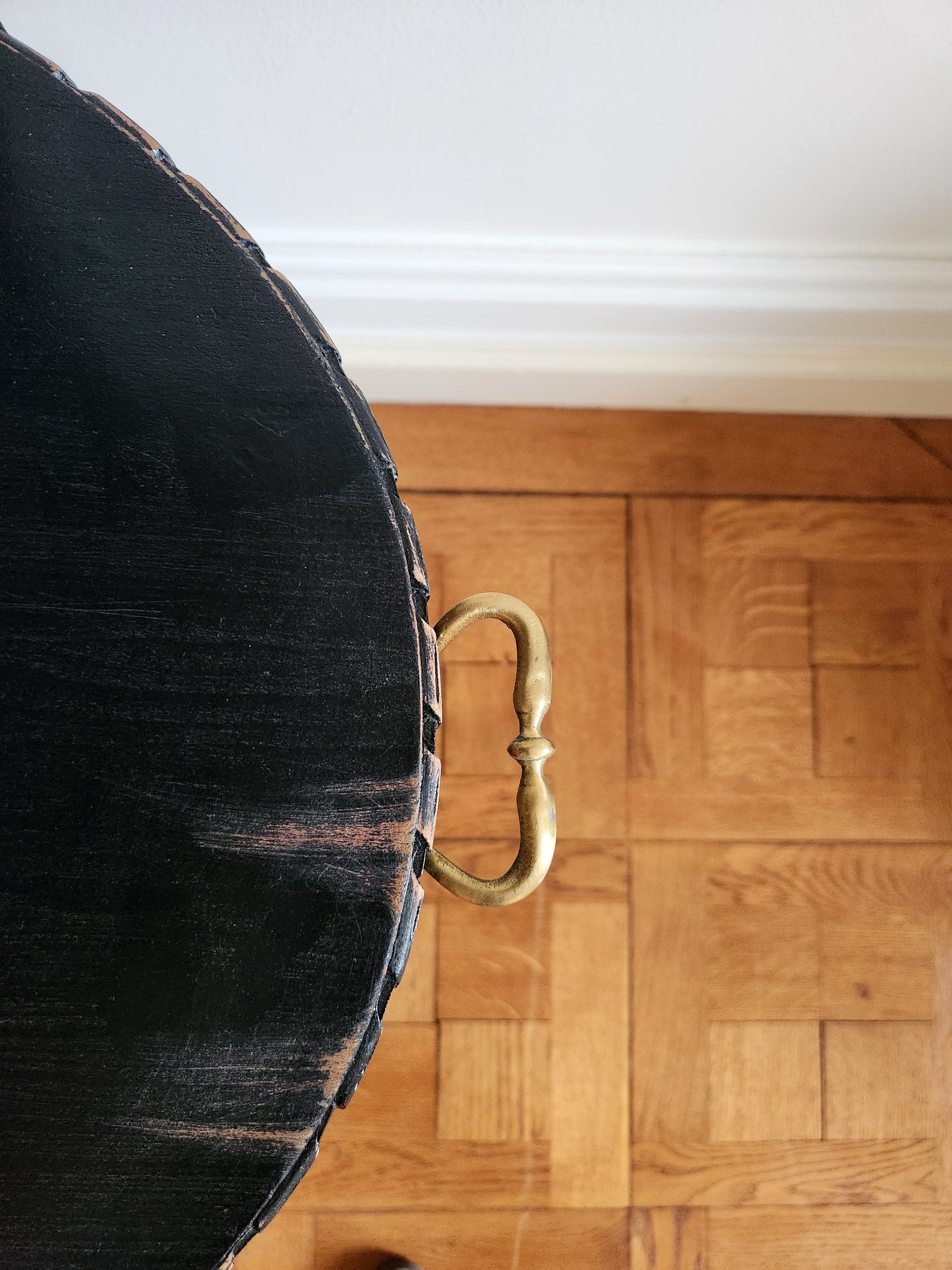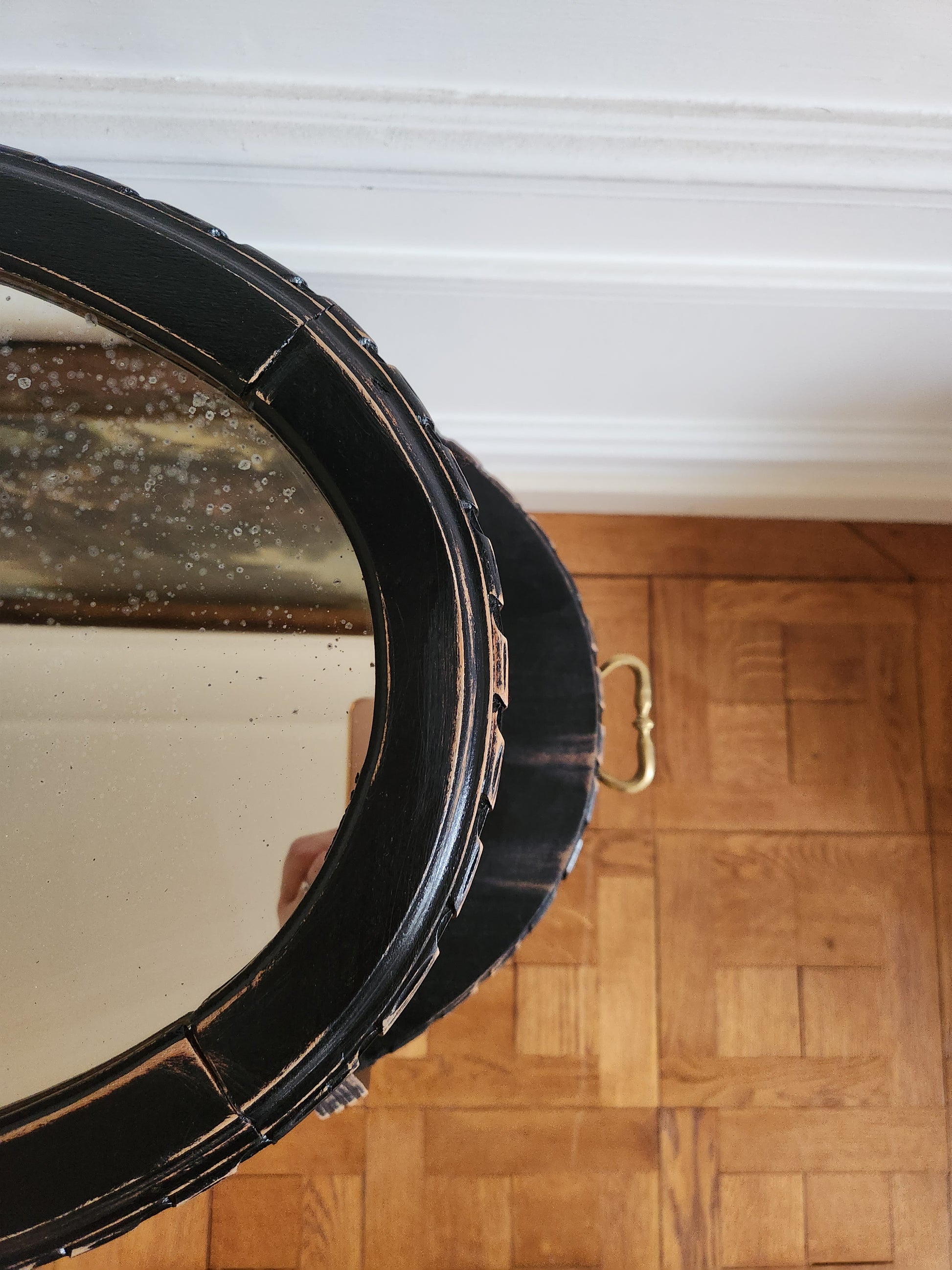 Le plateau supérieur est constitué d'un miroir ancien légèrement piqué, qui rend l'ensemble lumineux, précieux et unique.